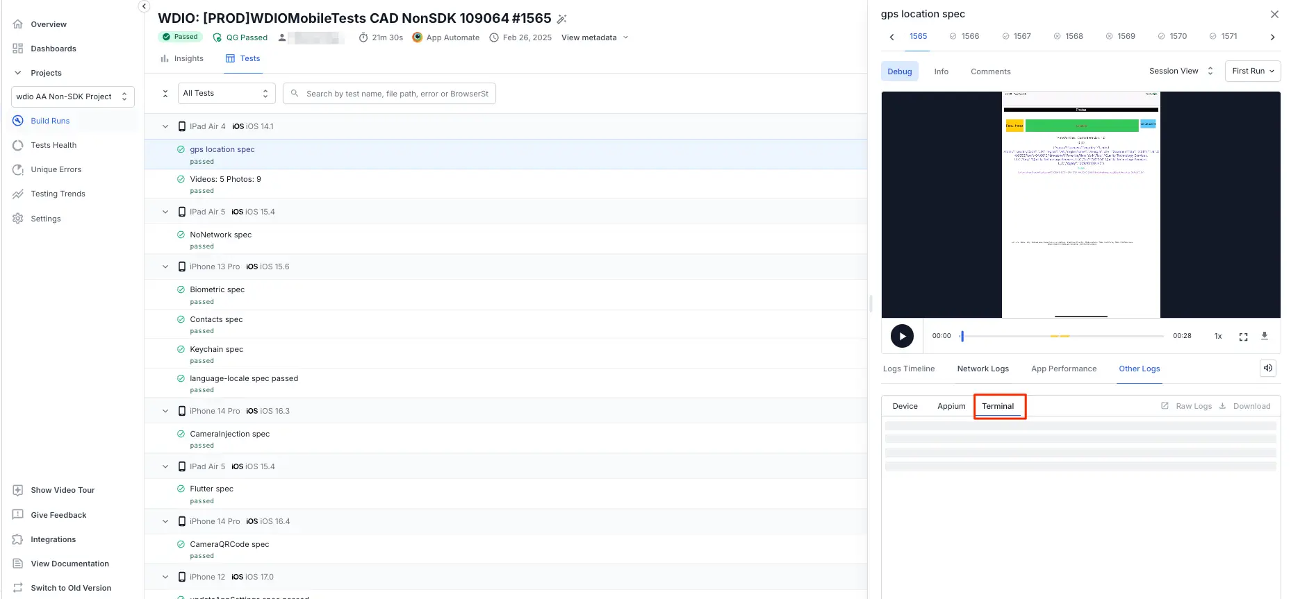 BrowserStack allows you to upload and view your Appium terminal logs using REST API. On the App Automate dashboard, click the Other Logs tab to view the terminal logs.