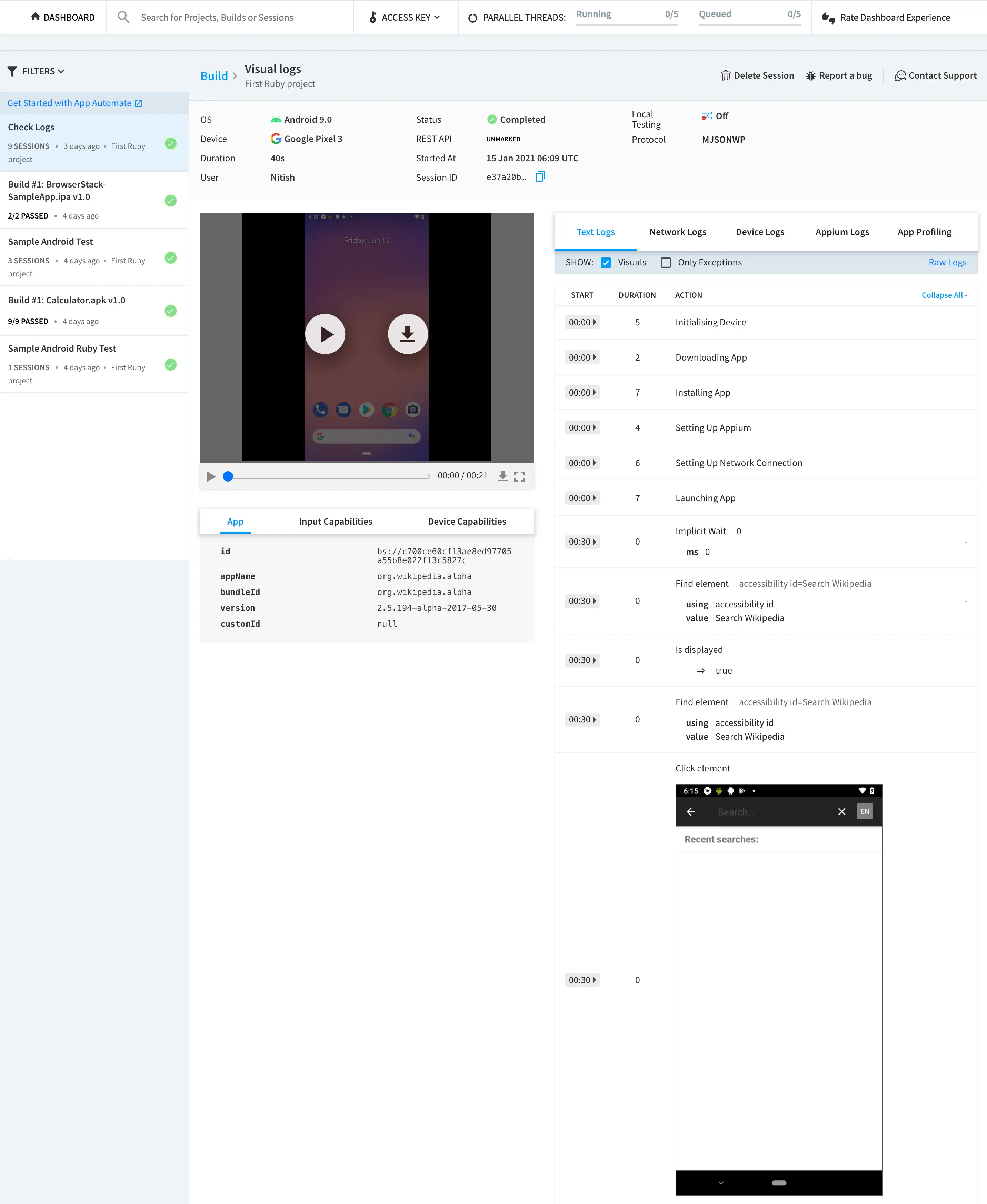 Visual Logs enable you to automatically capture screenshots for various Appium commands executed in your test session. Using visual logs you can: