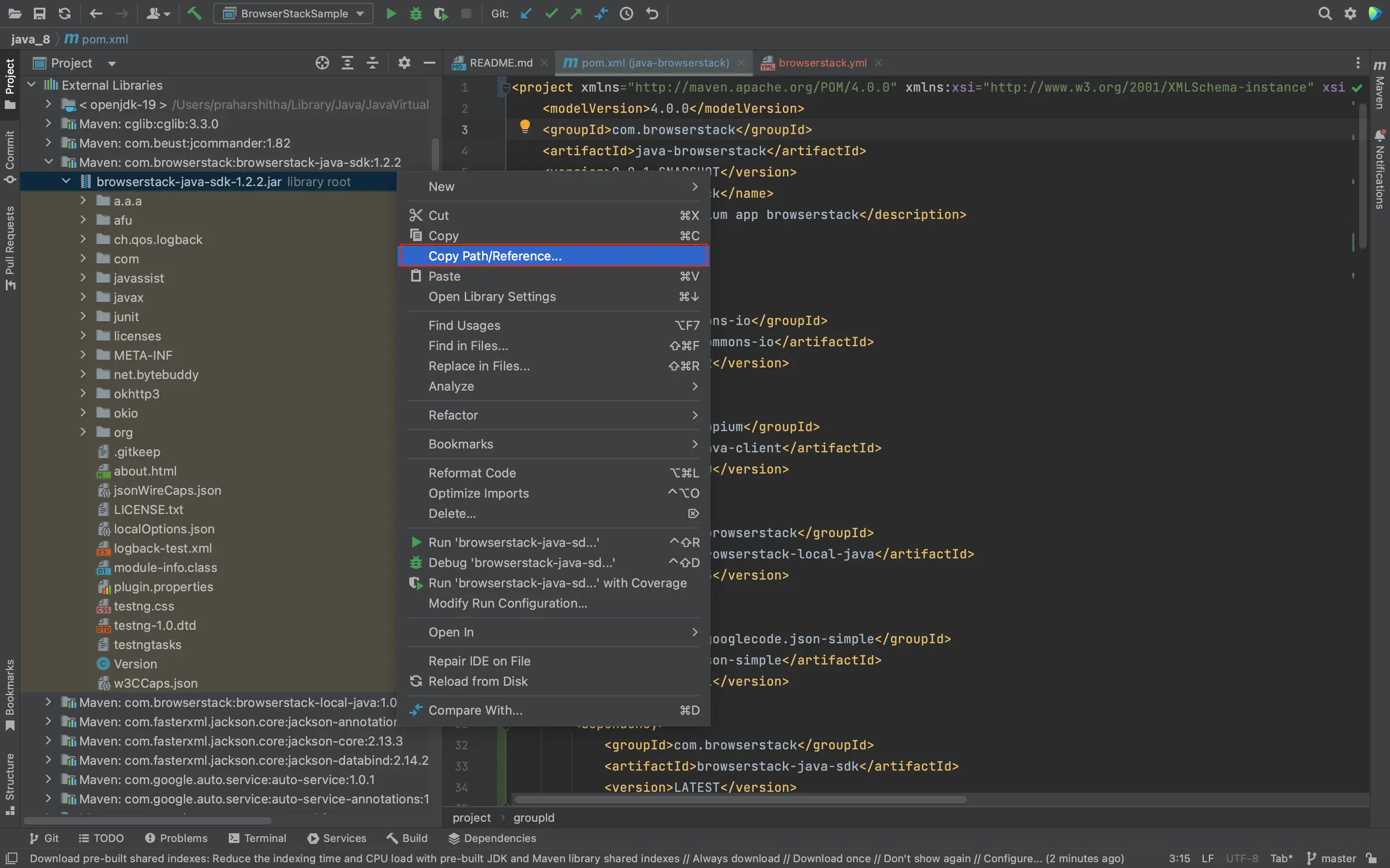 Search for the browserstack-java-sdk jar in External Libraries. Right-click the .jar file, select Copy Path/References, and then copy the absolute path: