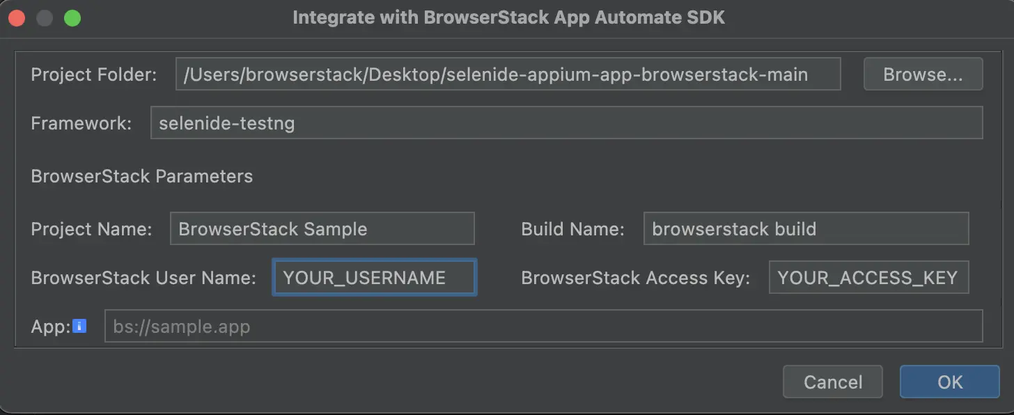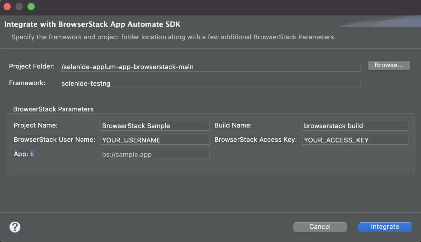 Right-click on your project folder > BrowserStack > select Integrate with App Automate SDK.