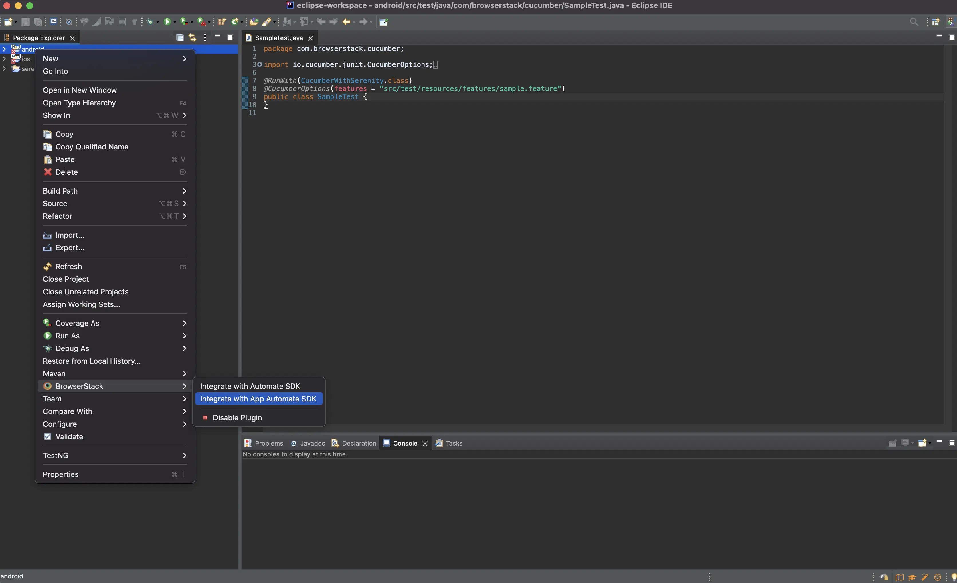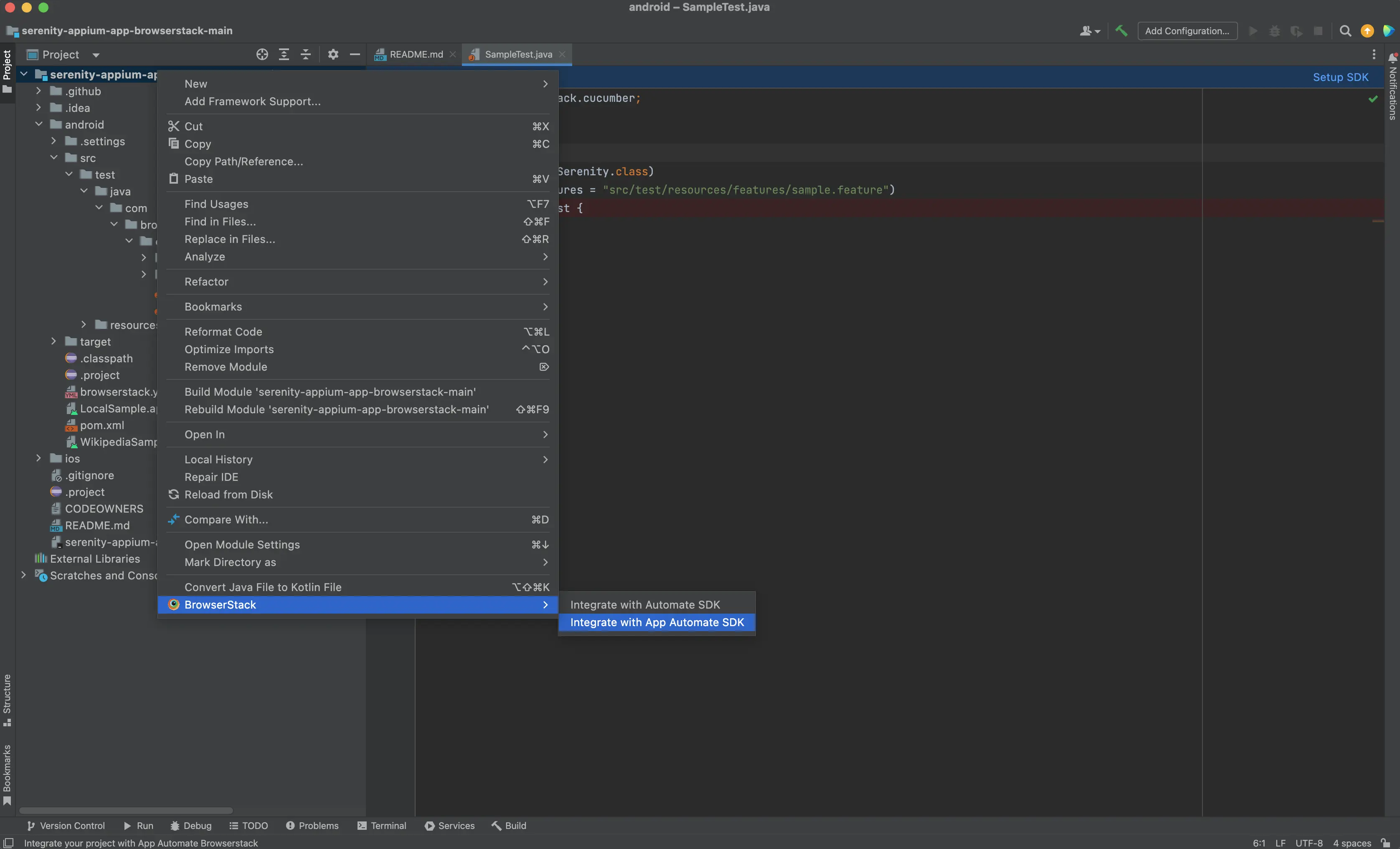 Right-click on your project folder > BrowserStack > select Integrate with Automate SDK.