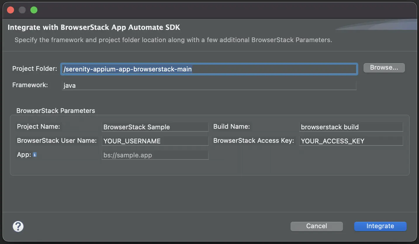 Select your Project Folder, Framework, and other BrowserStack Parameters, and then click Integrate.