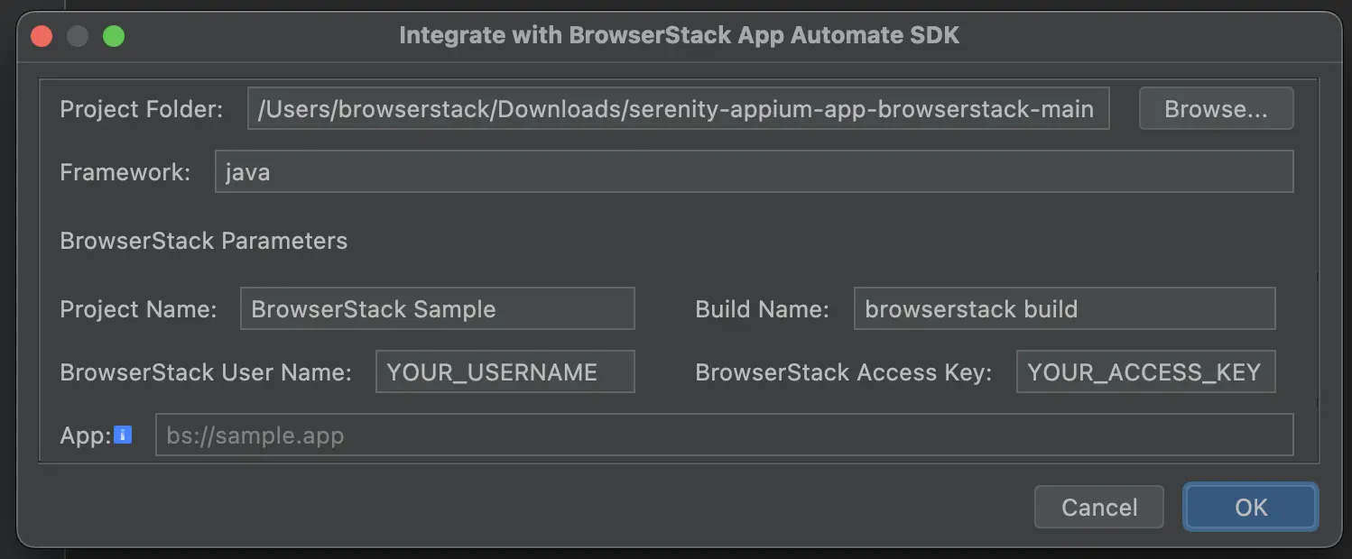 Select your Project Folder, add Framework and other BrowserStack Parameters then click OK.