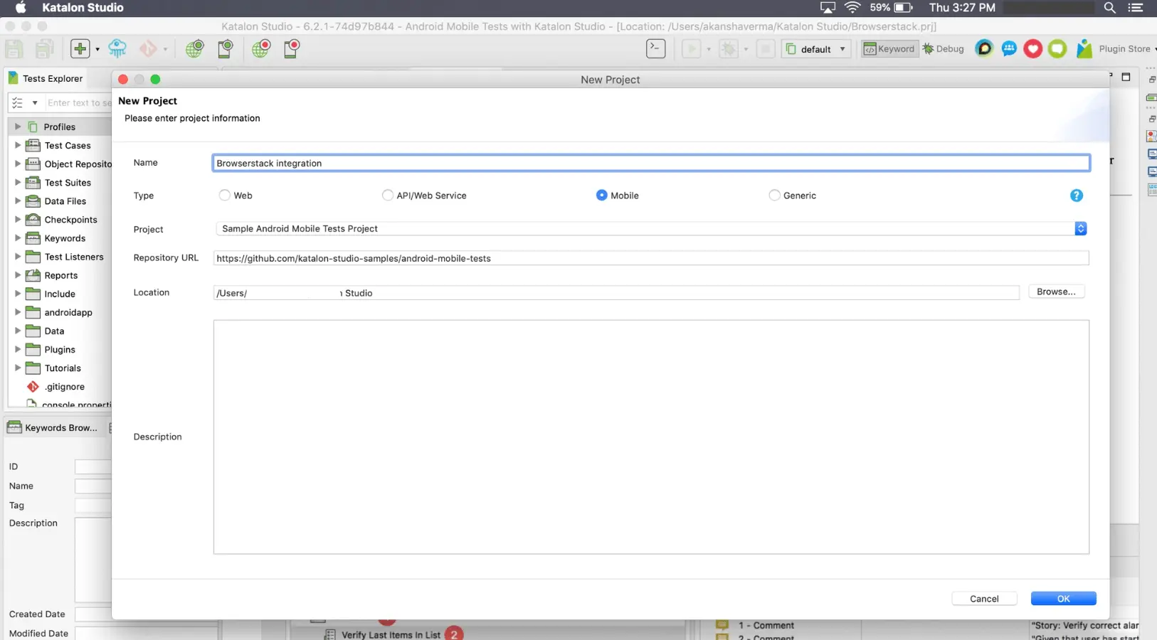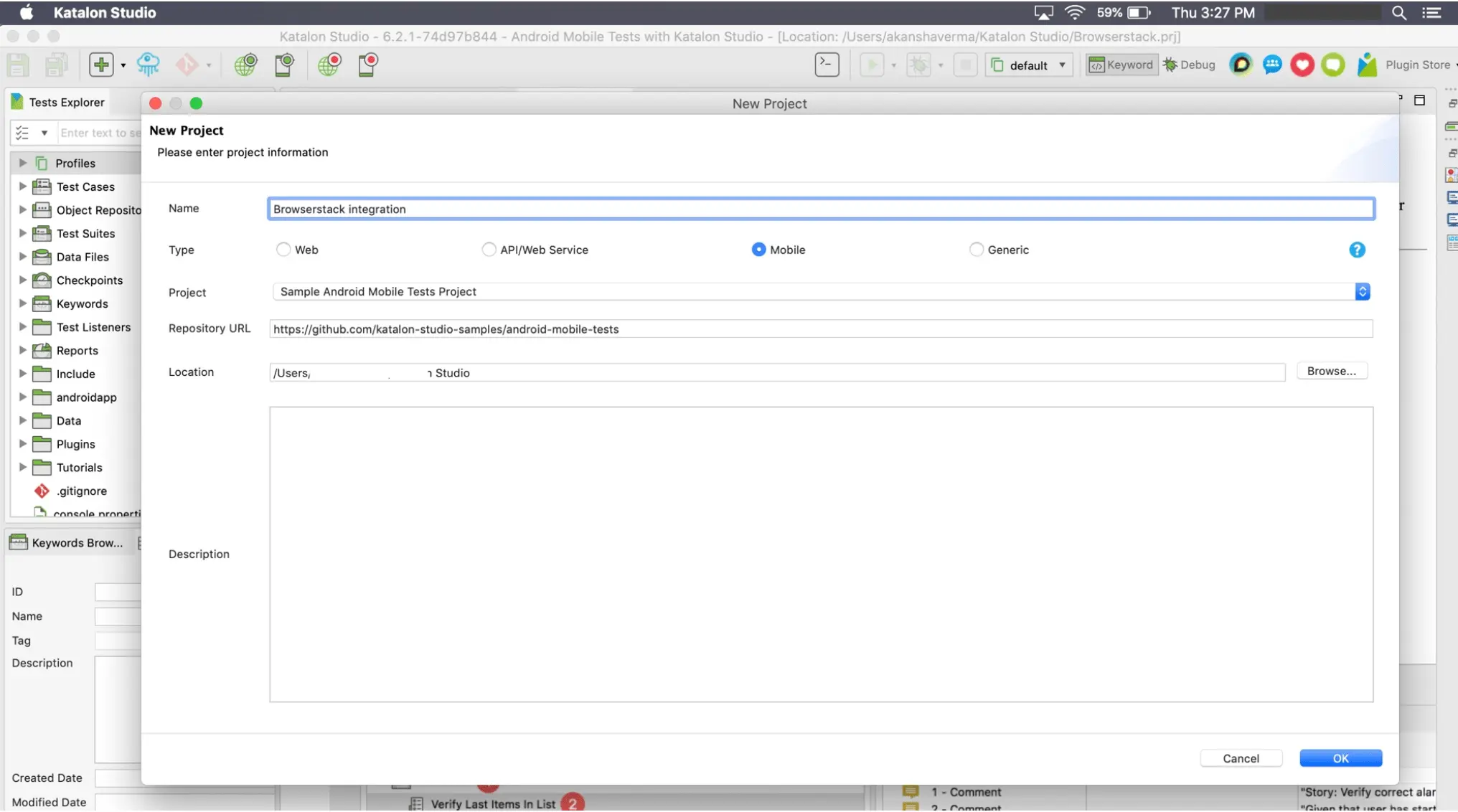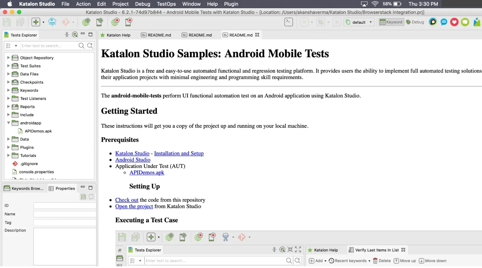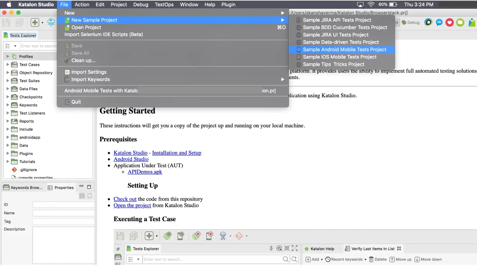 Download Katalon Studio by signing up for a free account at Katalon’s website. After installation, login to the Katalon Studio using your account credentials and create a new Sample Android Mobile Tests Project. The process has been detailed for the sample app and test cases provided by Katalon, you can replace the app with your own app and make changes in your test cases accordingly.