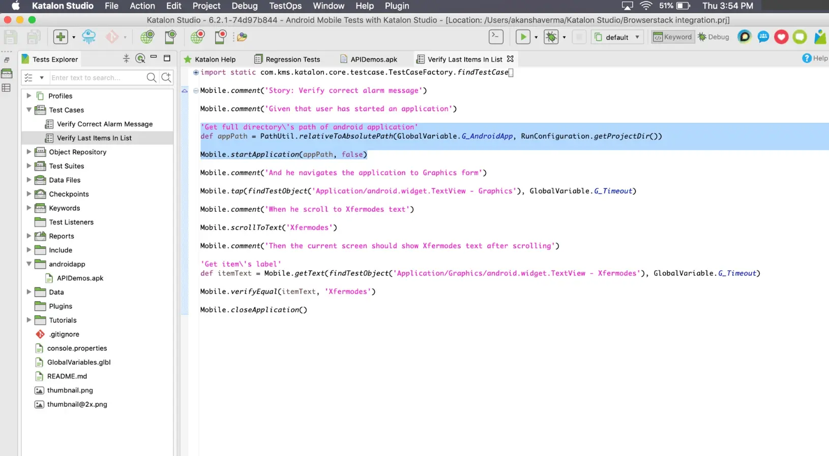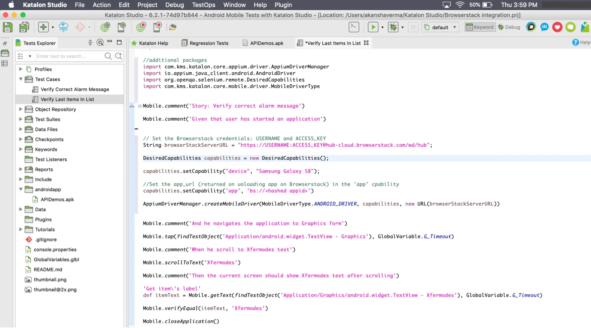 In the Tests Explorer window go to the folder androidapp → APIDemos.apk. This is the application which will be tested on BrowserStack.