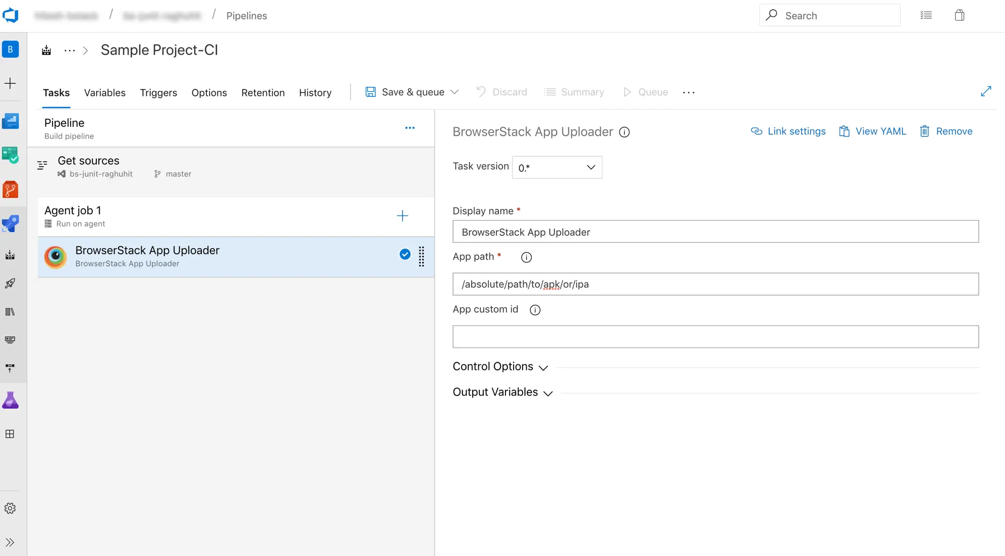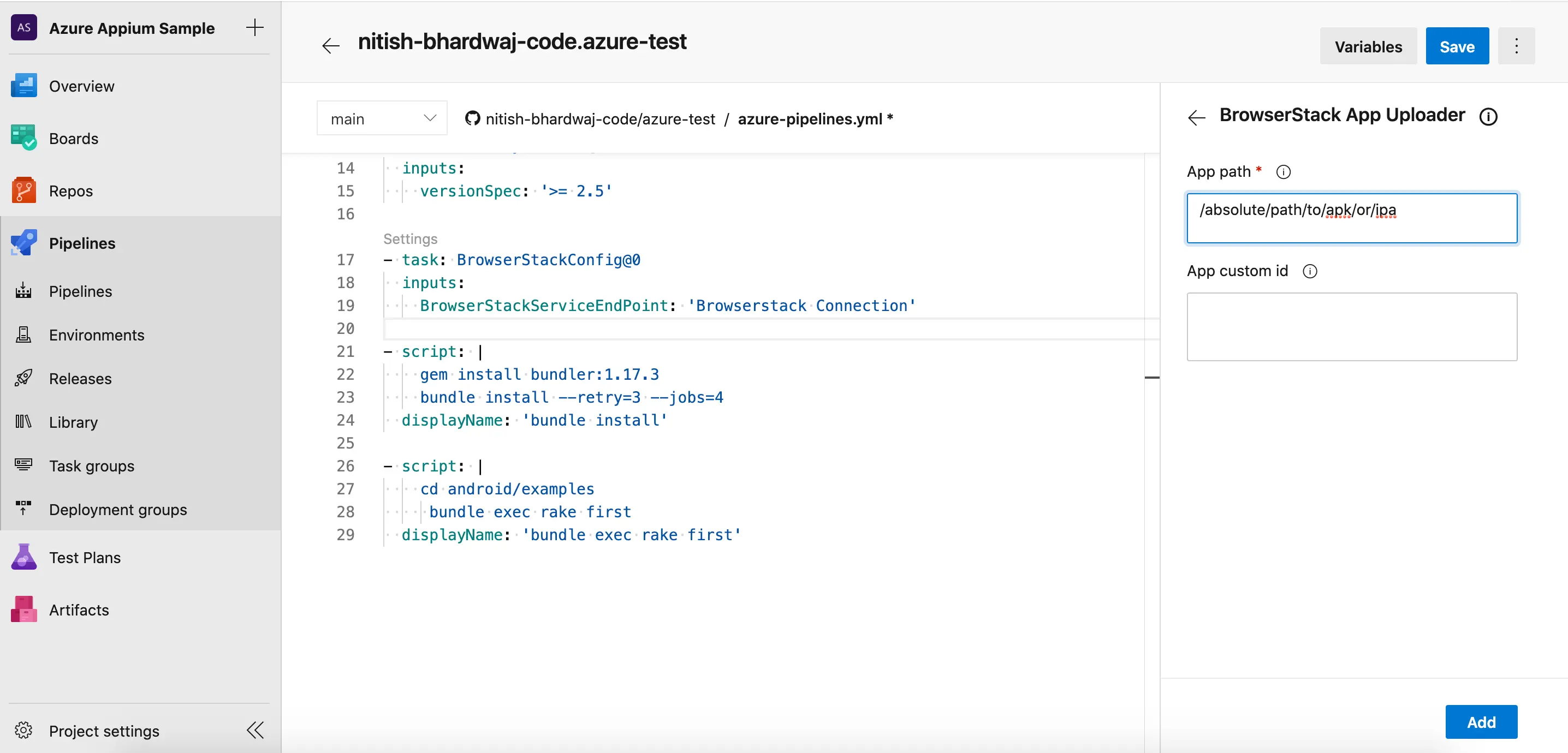 Select the BrowserStack App Uploader task from the right task pane in the YAML edit window. This will set the BROWSERSTACK_APP_ID environment variable with the App Id returned as a response after the app upload.