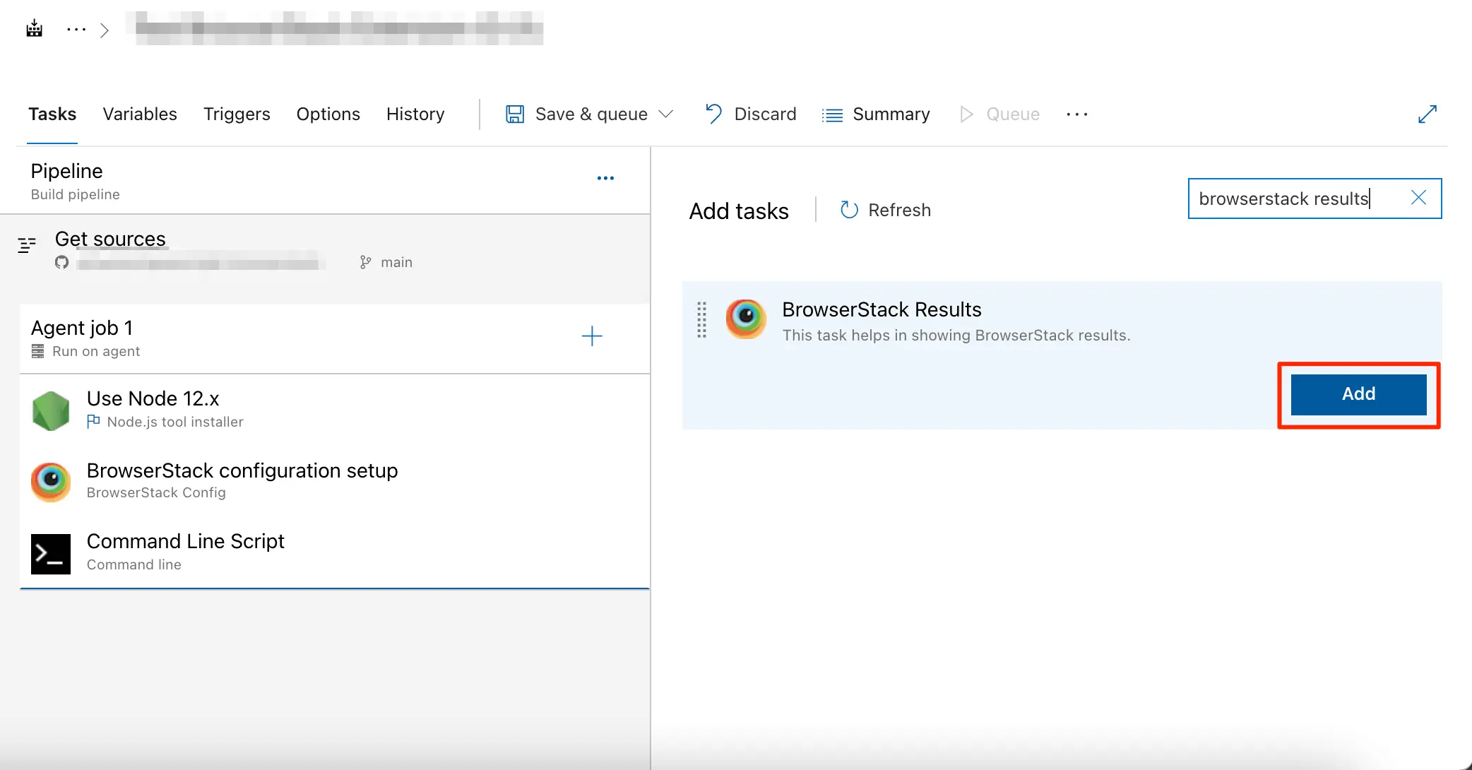 In the Tasks tab, click + on the Agent job 1 card to add the BrowserStack Results task.