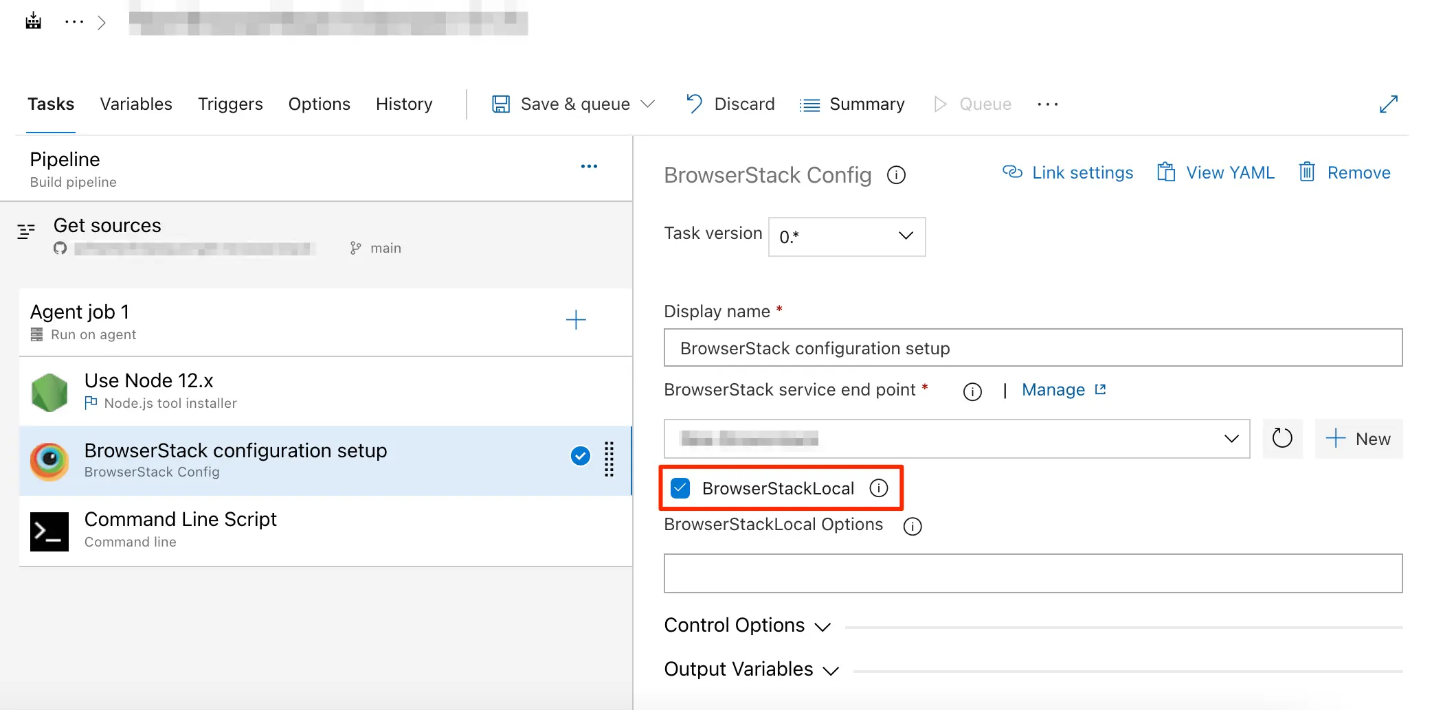 When you create a service connection, the BROWSERSTACK_USERNAME and the BROWSERSTACK_ACCESS_KEY are automatically added as variables during the configuration step.