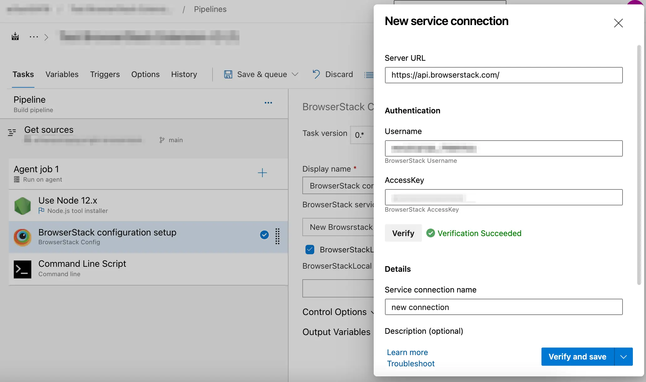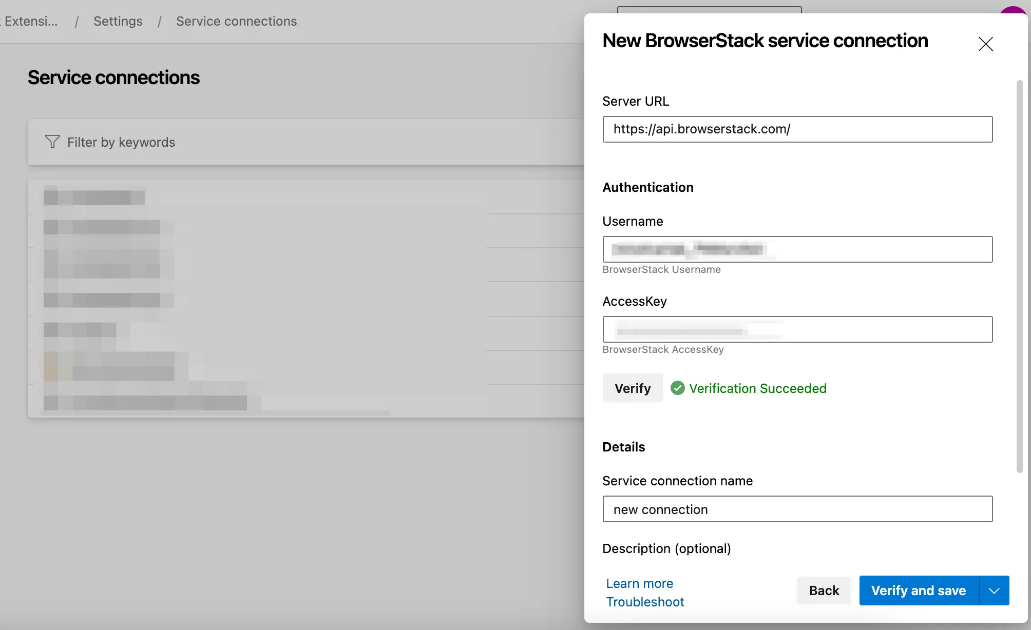 browserstack-connection, and then click Verify and save. The service connection gets added and you’re redirected to the Service connections page.