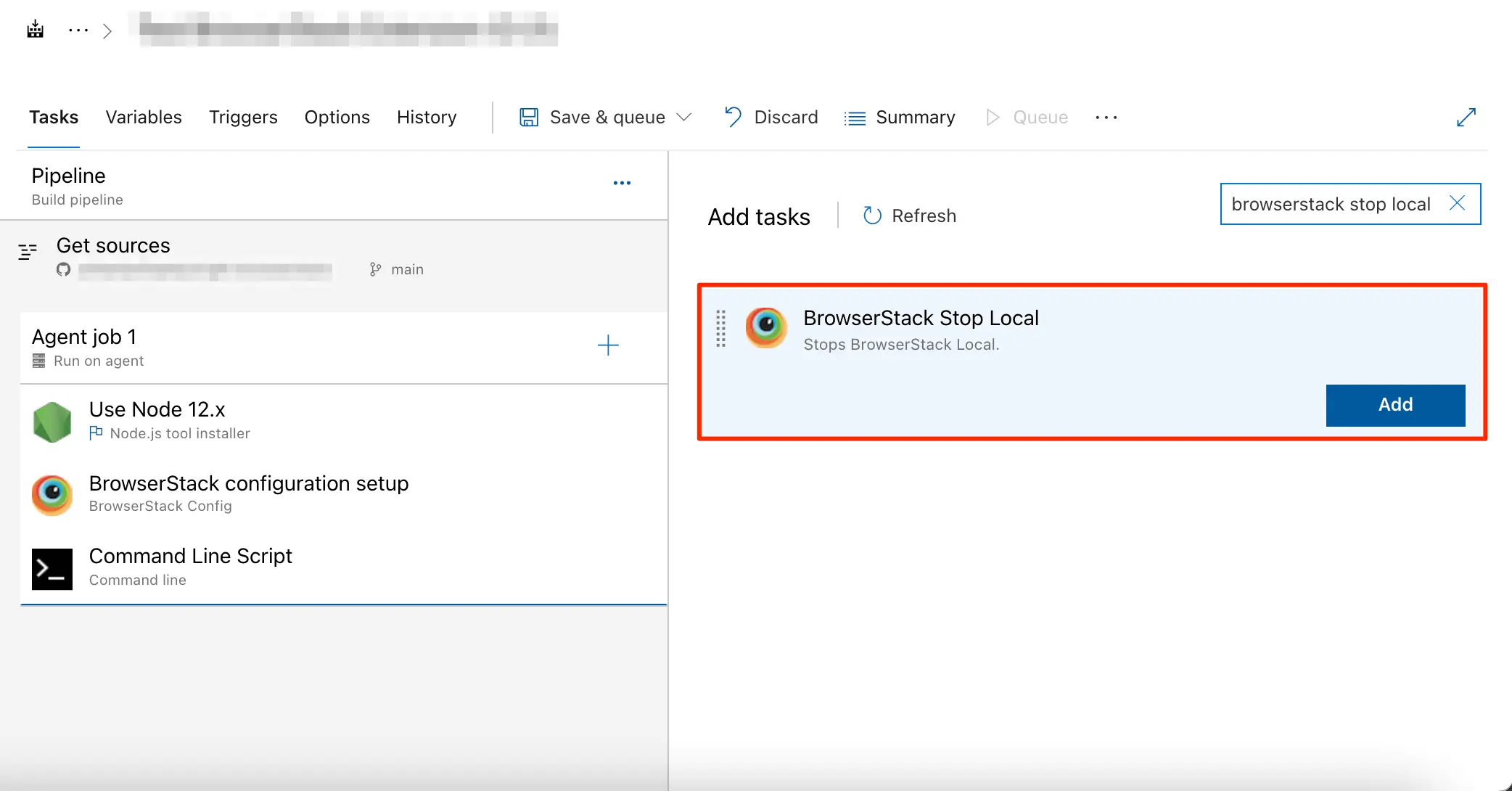 In the Add tasks pane, select the BrowserStack Config task from the tasks list, and click Add.