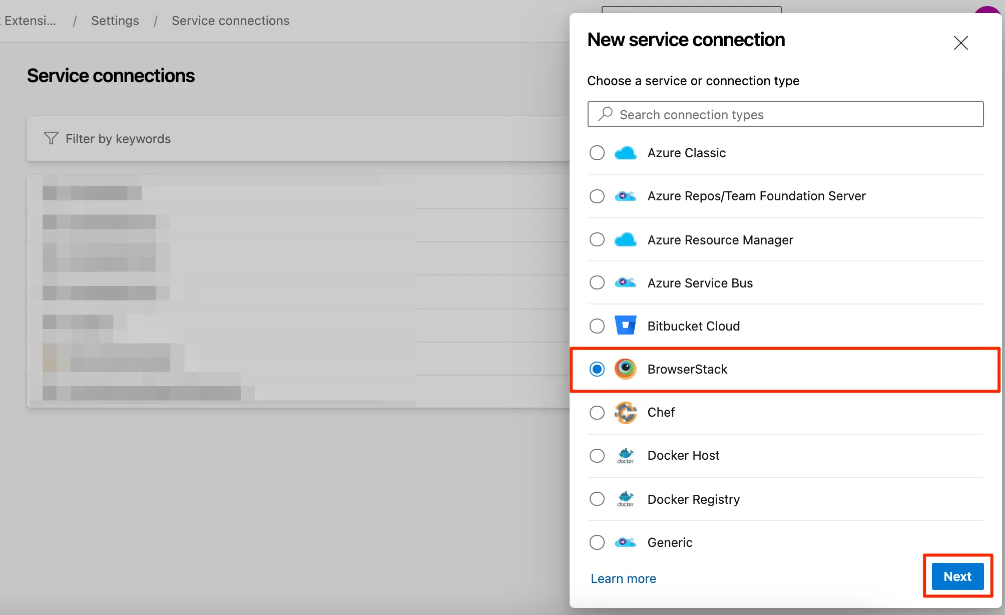 In the New service connection section, select BrowserStack from the given list, and click Next.