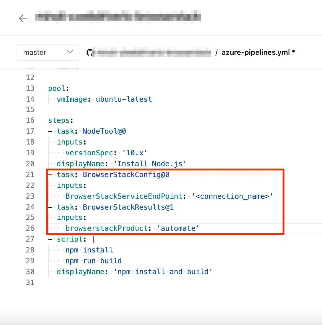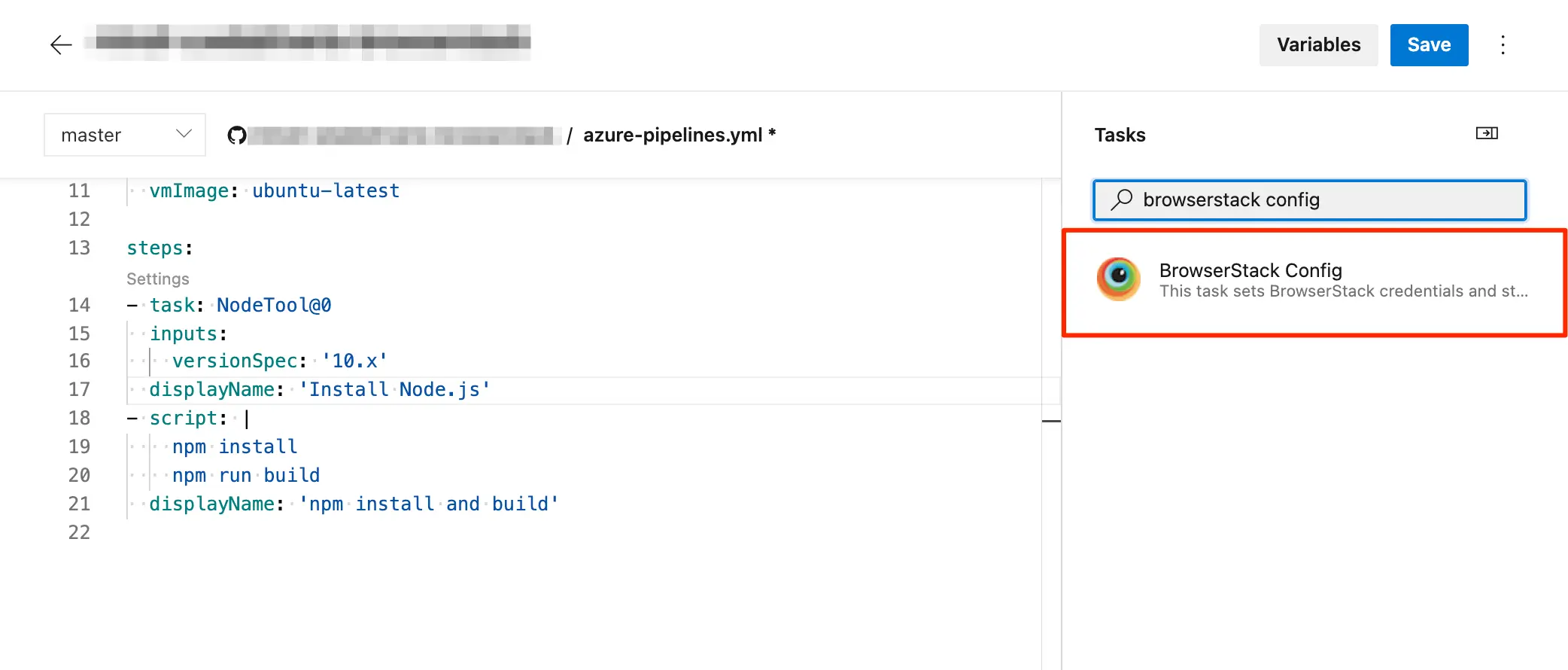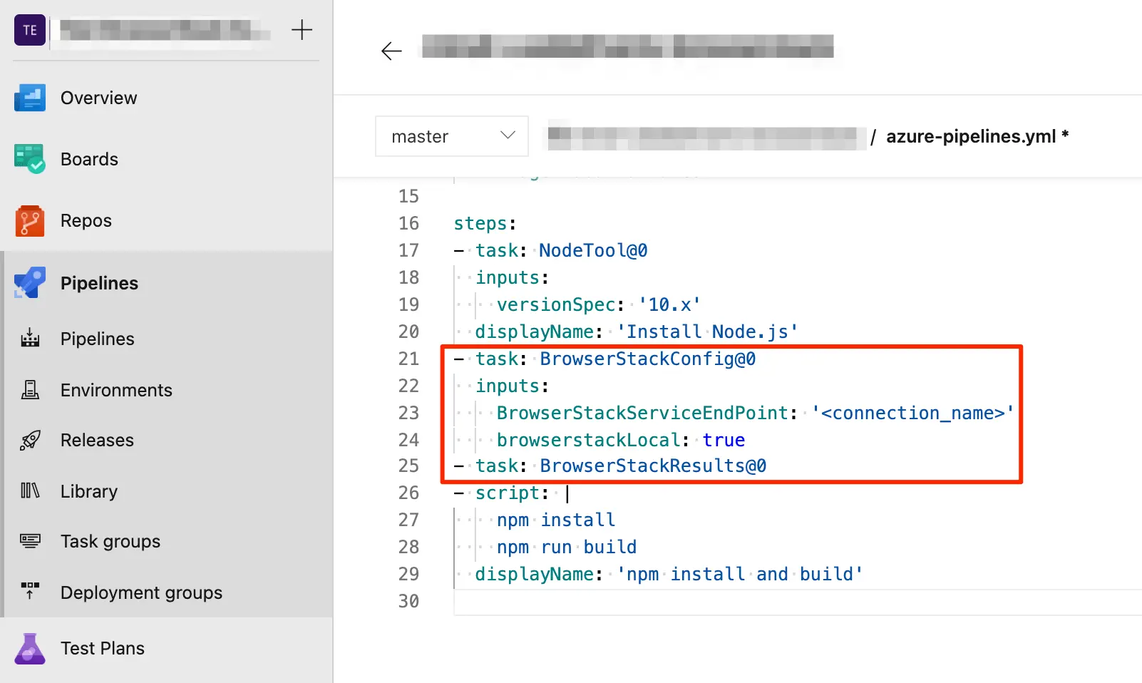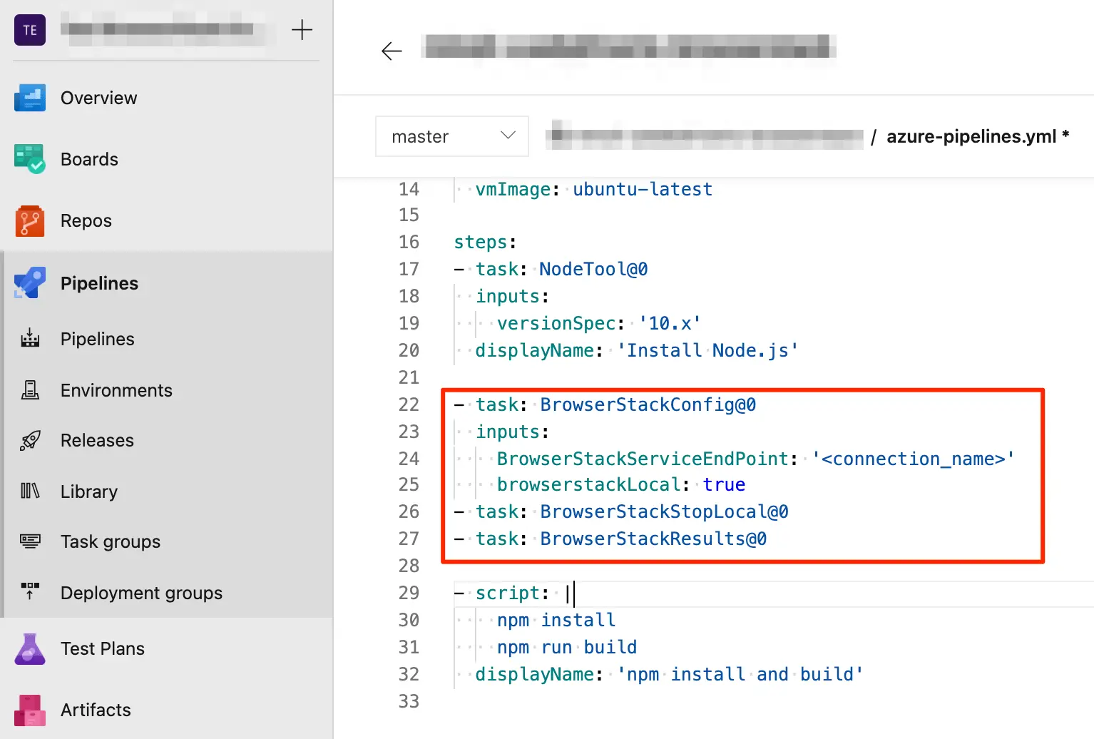 The following image shows the azure-pipelines.yml file with all the BrowserStack tasks configured to run your test on BrowserStack.