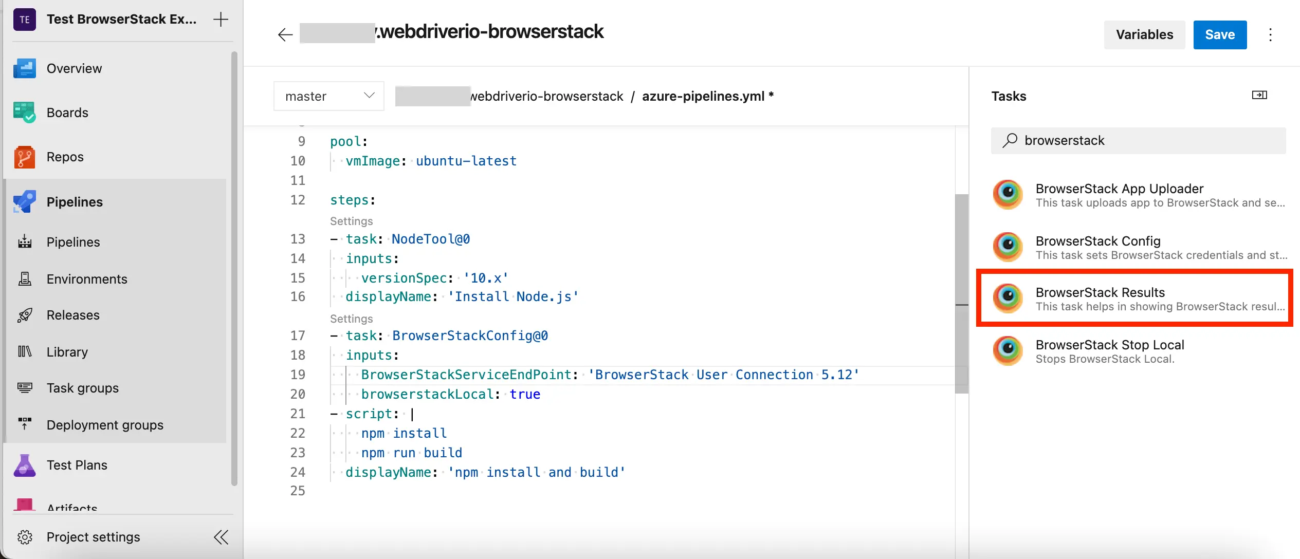 The BrowserStack Azure Pipelines extension enables you to embed the test results from BrowserStack into Azure Pipelines. We currently support viewing test reports in Azure Pipelines with a select set of languages and frameworks, which are Java with JUnit/TestNG, and Node with Protractor and WebdriverIO. The sections below describe how to configure your project to generate BrowserStack test reports.