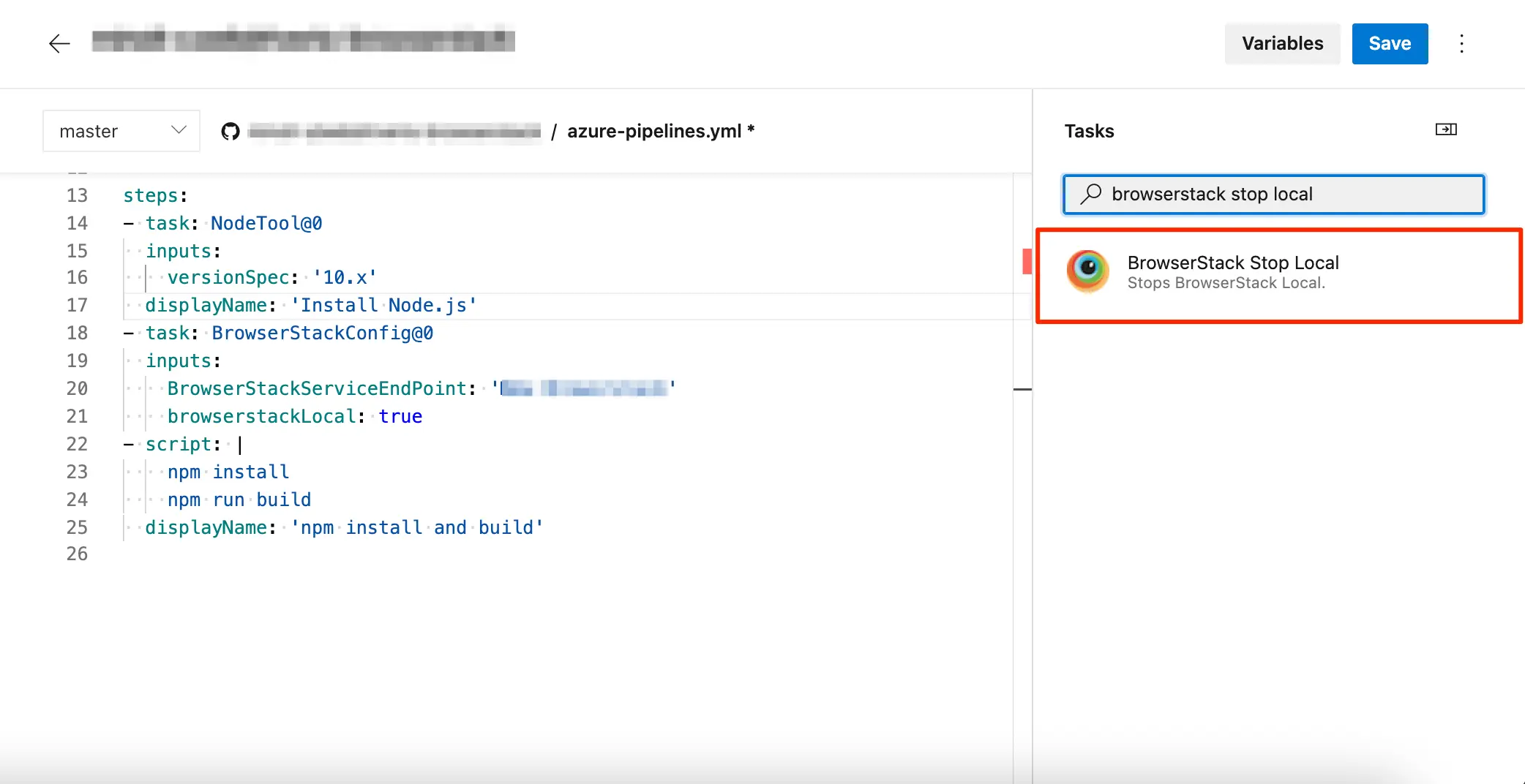 It is recommended to stop the BrowserStack Local binary after tests have been executed to optimize your resources. Add the BrowserStack Stop Local task in your pipeline using the following steps: