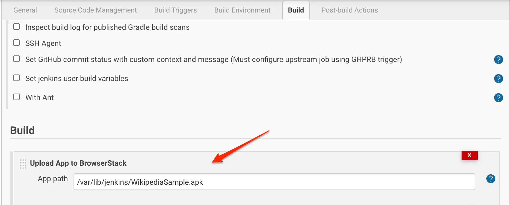 Next, you will need to upload your app to BrowserStack servers and for that, you will need to configure the app upload build step. Follow these steps to configure a build step to upload your app to BrowserStack servers: