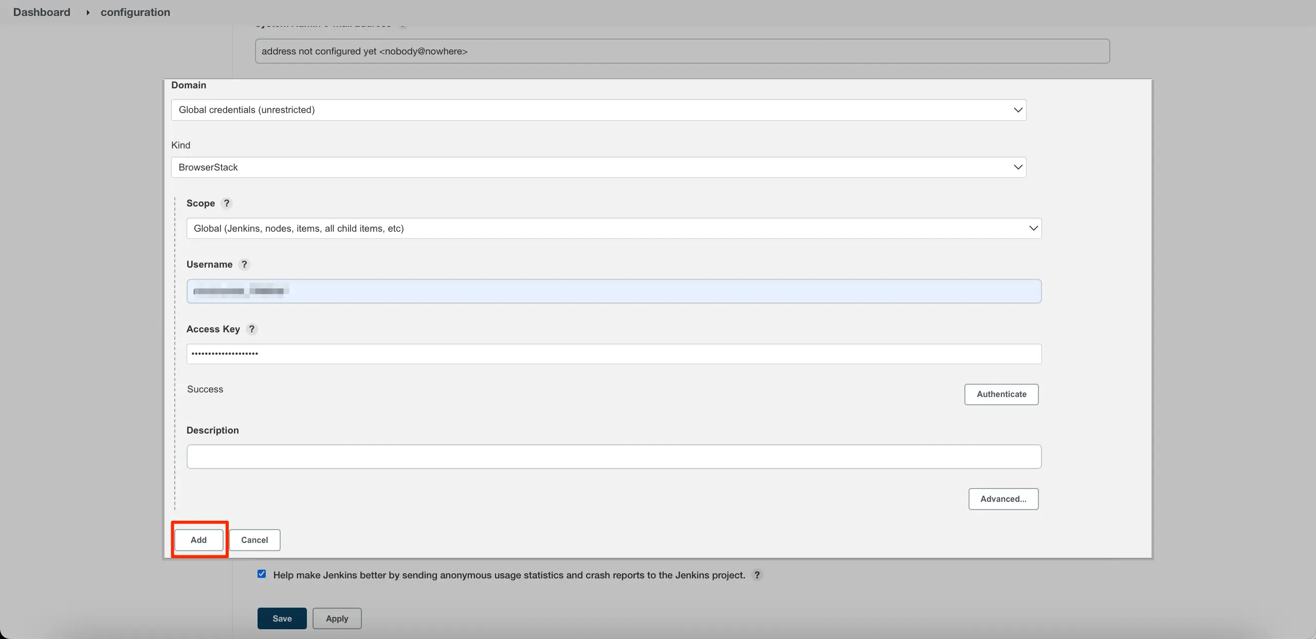 http://localhost:8080/), click Manage Jenkins > Configure System. - Under the BrowserStack Credentials section, click Add > Jenkins.