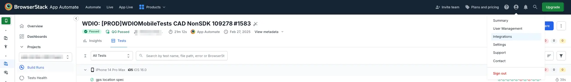 Step 1: Once you reach your App Automate dashboard, select Integrations as shown in the following figures: