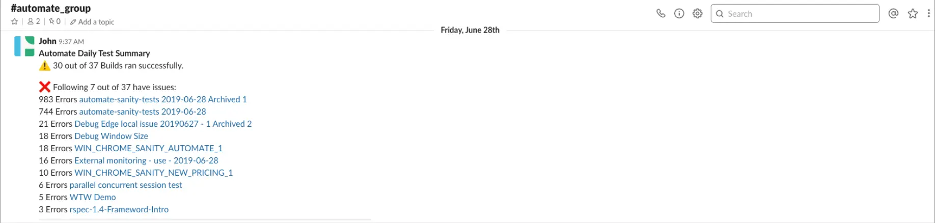 In case of failed tests, a message is sent to your desired channel on Slack with the following information: