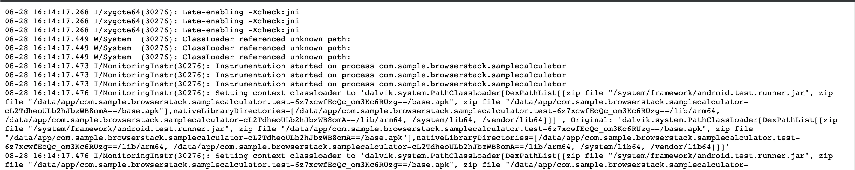Device logs are system logs specific to your application generated by Android logcat. They can help you access your application logs and are especially helpful if the application under test crashes during test execution.