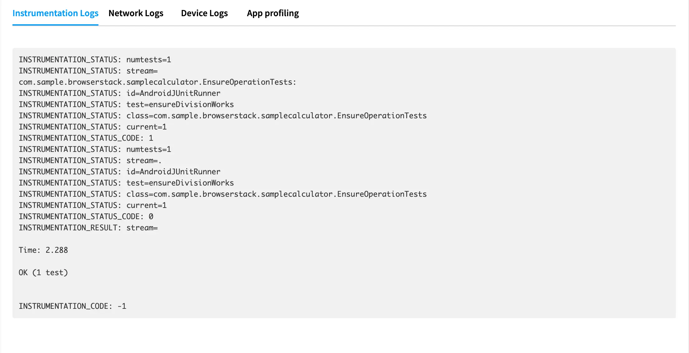 Instrumentation logs are a comprehensive record of your Espresso test executions. They are used to identify all the steps executed in the test and troubleshoot errors for any failed steps. This is the output generated by the Espresso test runner (typically AndroidJUnitRunner). Instrumentation logs are accessible both from the App Automate dashboard, as well as using our REST API.