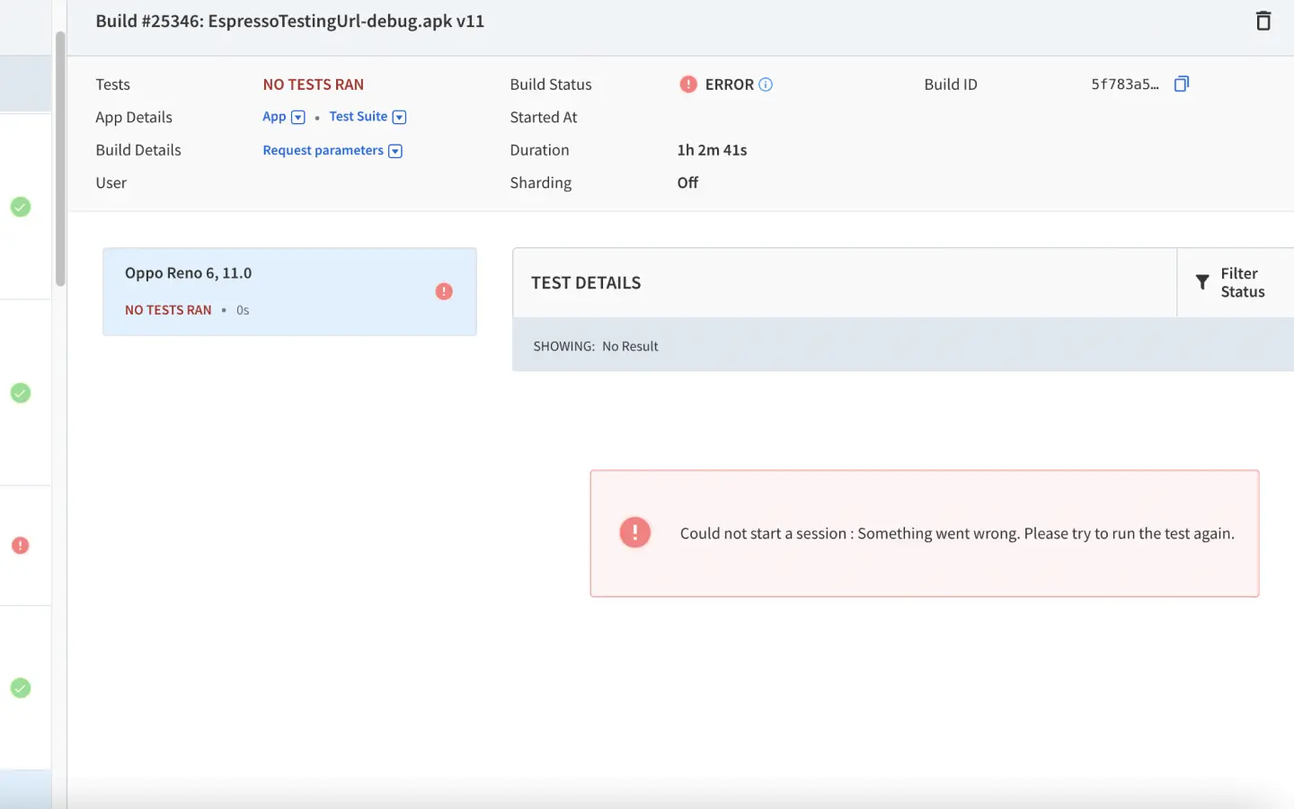 On the App Automate dashboard, the Tests/Sessions field tells you the number of tests that have passed or failed. However, if your tests do not run at all, then you see the No Tests Ran error in the Tests/Sessions field. The test details section shows either of these two error messages: