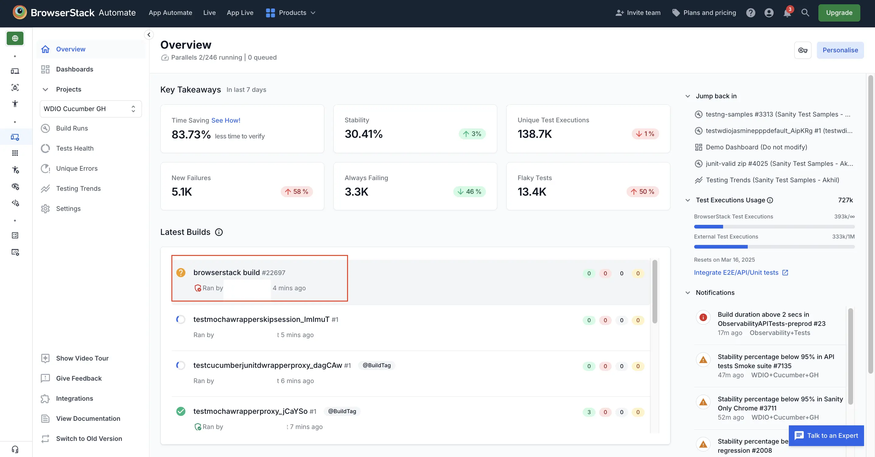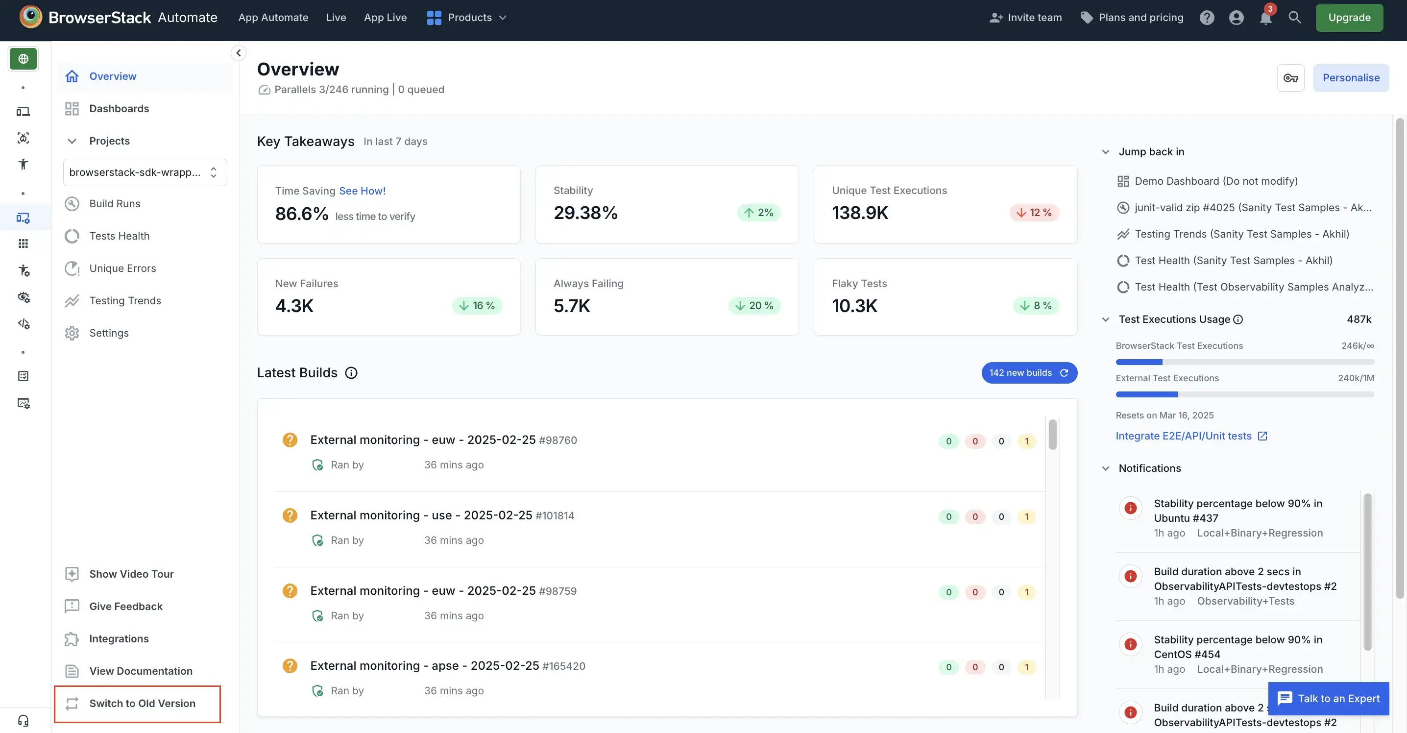With the new dashboard, Automate and App Automate users get a more organized, efficient, and insightful way to manage and analyze test results. The new dashboard streamlines the testing process, reduces testing cycle time, and provides deeper insights into test failures, flakiness, and overall test health.
