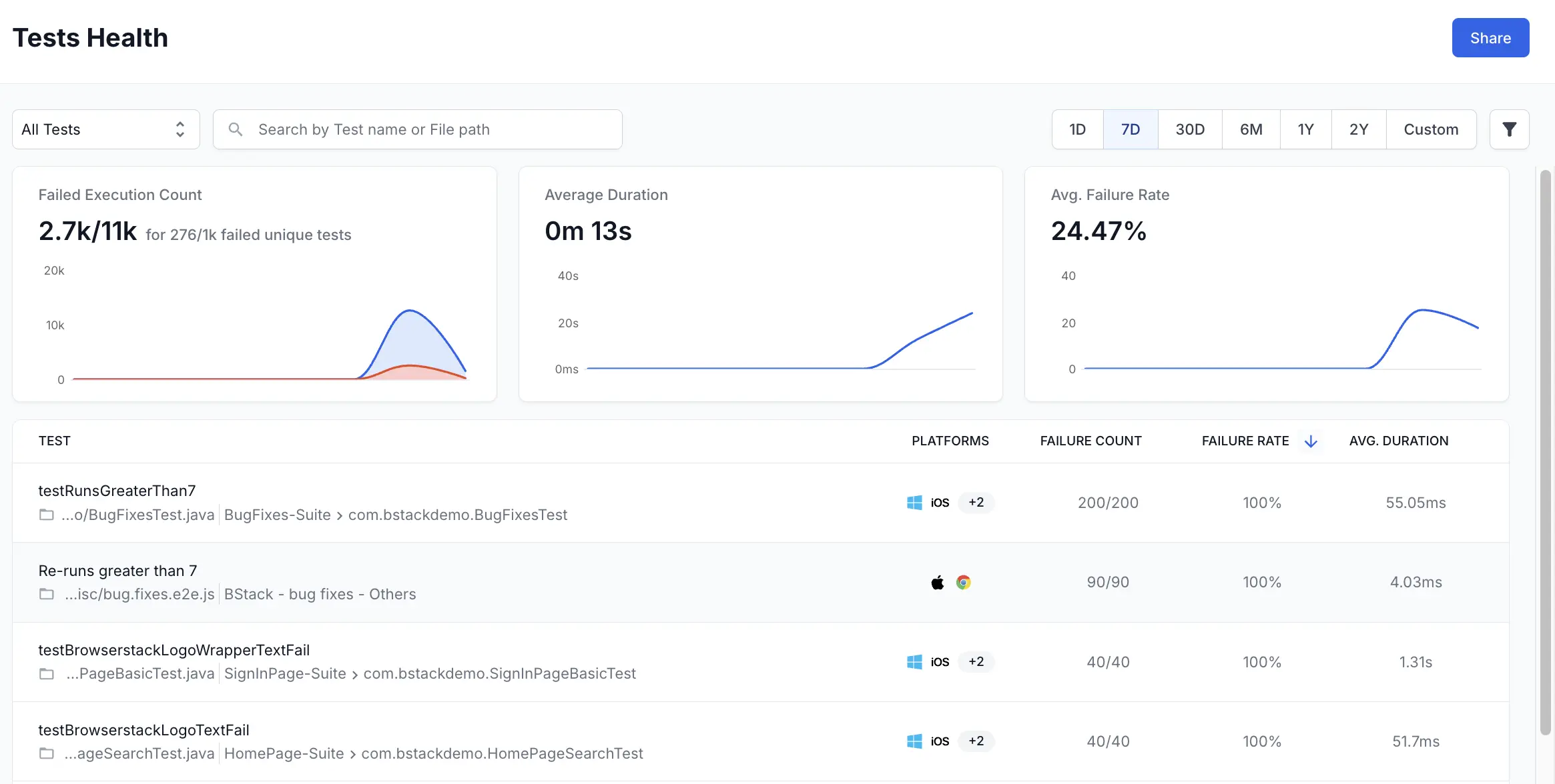 Health Dashboards: Tracks the overall health of your tests, including failure rates, flakiness, and performance. You can quickly identify which tests require attention and prioritize efforts to improve the overall health of your test suite using the Tests Health dashboard.