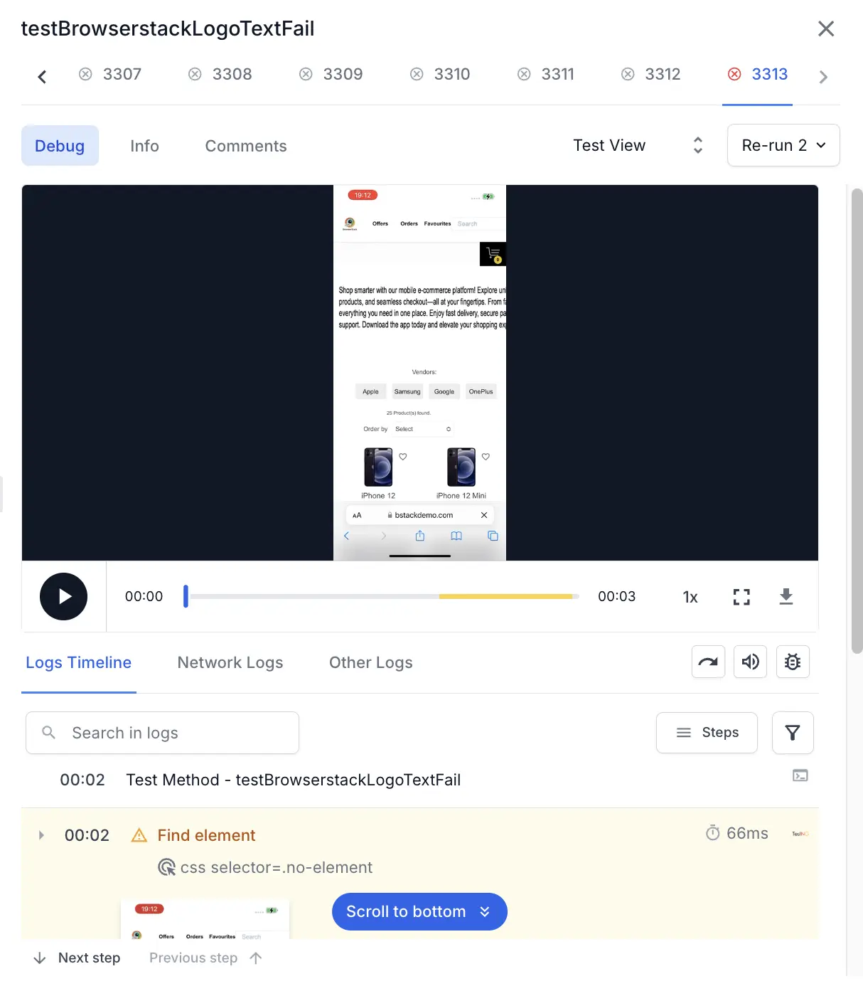 Timeline Debugging: Allows you to debug failures by investigating logs, videos, and stack traces in one place. The Timeline Debugging feature offers a comprehensive view of how a test performed earlier, which failures occured earlier, and what resolutions were applied.