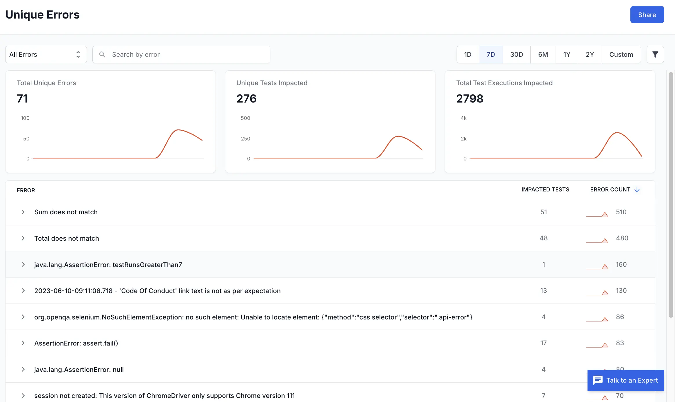 Unique Error Grouping: Groups similar errors together, reducing the time needed to debug multiple failures. When you know the unique errors that cause the maximum number of failures and how to fix them, you can apply the same fix at all places and improve your test suite.