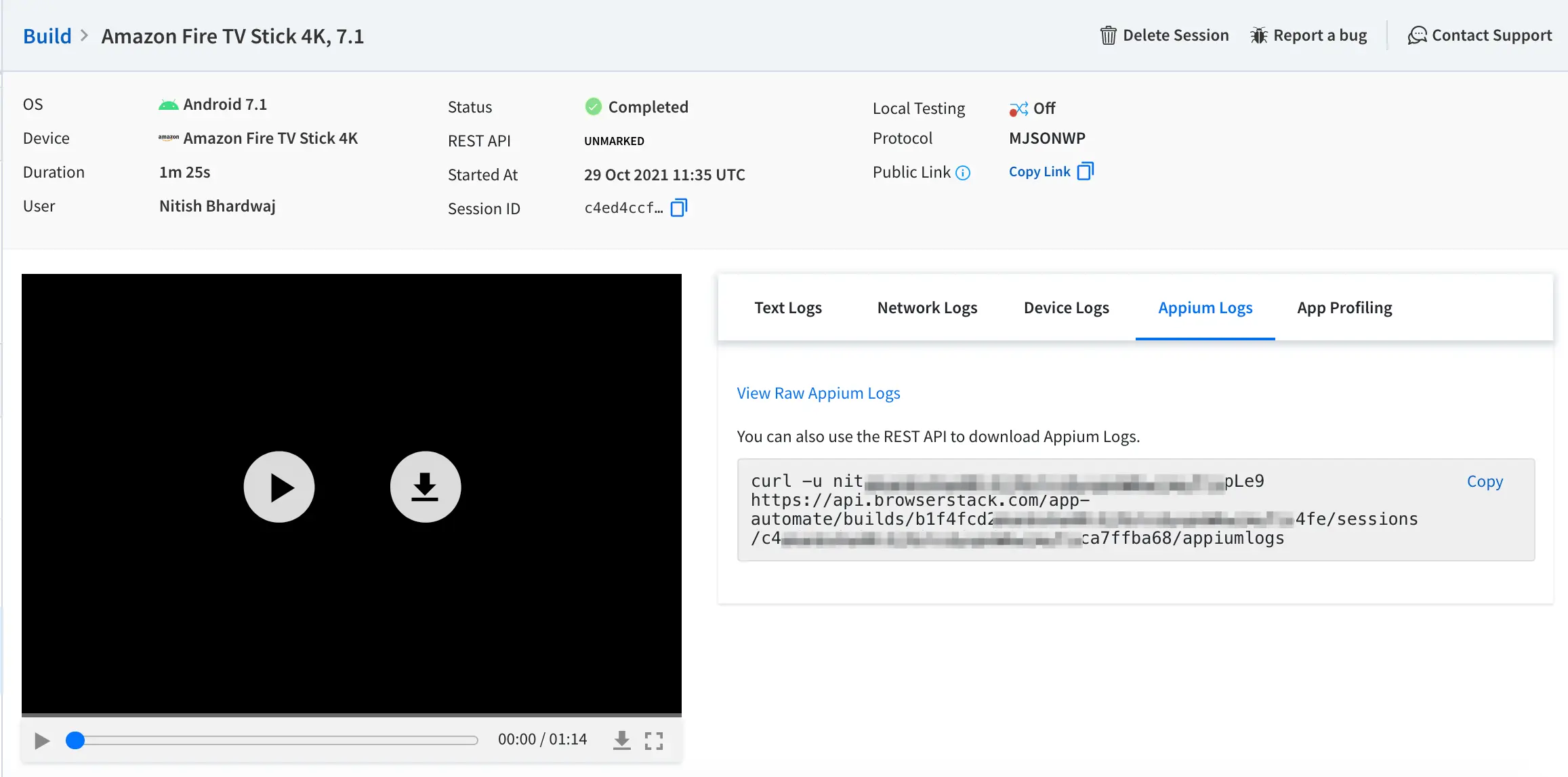 To access the Appium server logs, in the App Automate dashboard, go to your build. Select the test and click the Appium Logs tab. You can download the Appium logs using View Raw Appium Logs link.