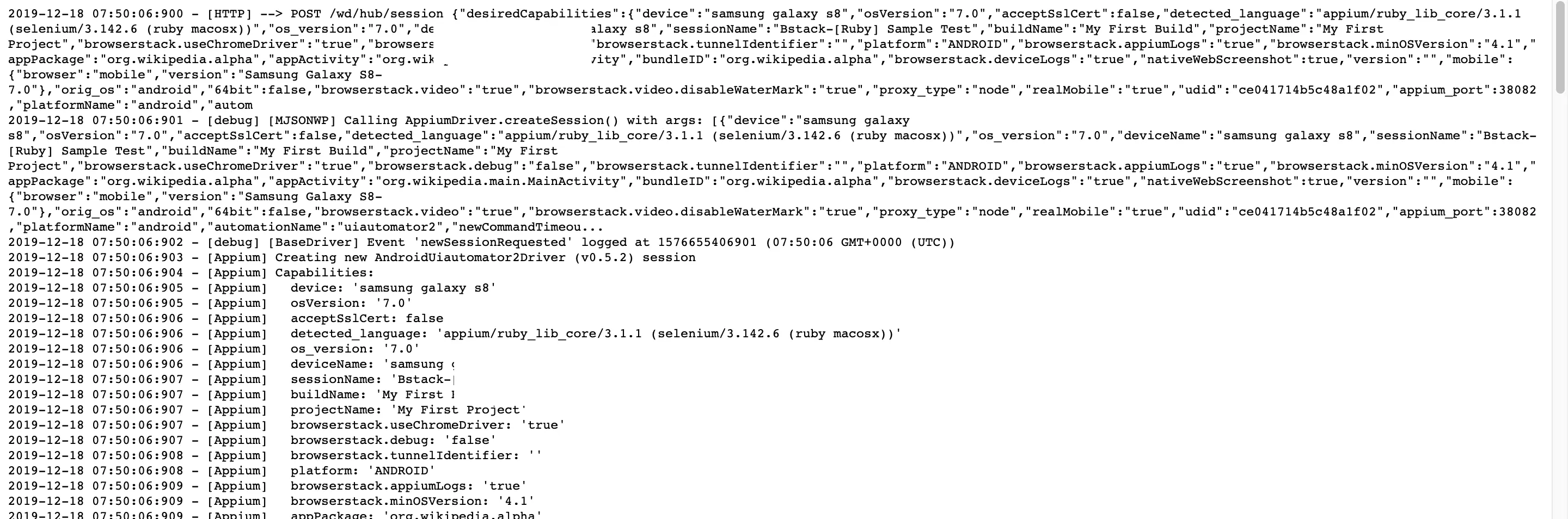 Appium logs are generated by the Appium server and contain a detailed test execution record of your Appium test session. These logs can help you troubleshoot any errors in cases where your test session failed. Appium logs are enabled by default. To disable appium logs, use the browserstack.appiumLogs capability.