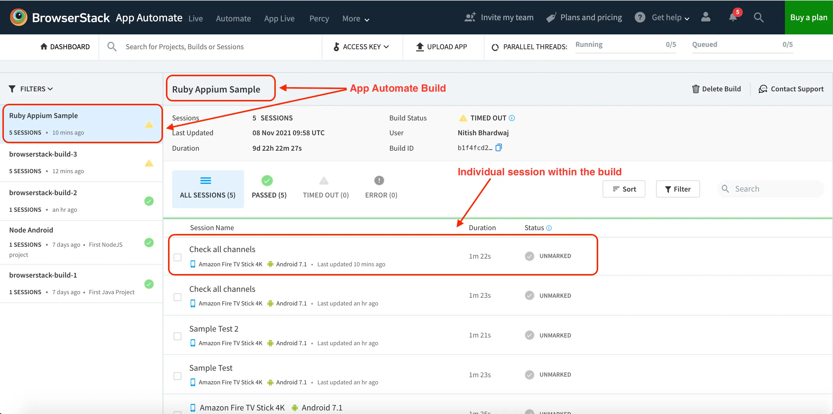 The following snapshot of the App Automate Dashboard shows the list of builds on the left and the sessions pertaining to the selected build, on the right: