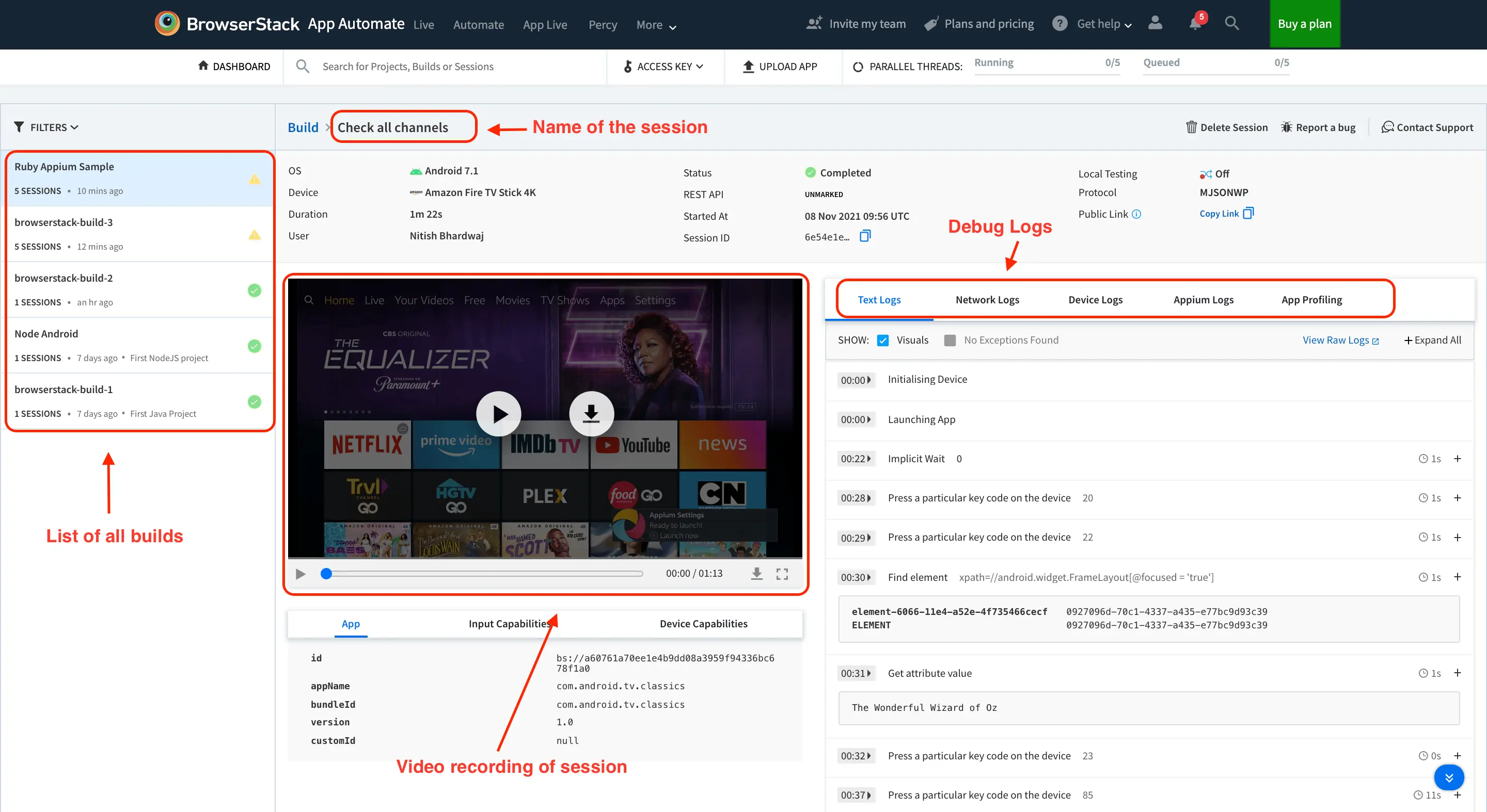 The session details view contains the video of the test and the debugging logs.