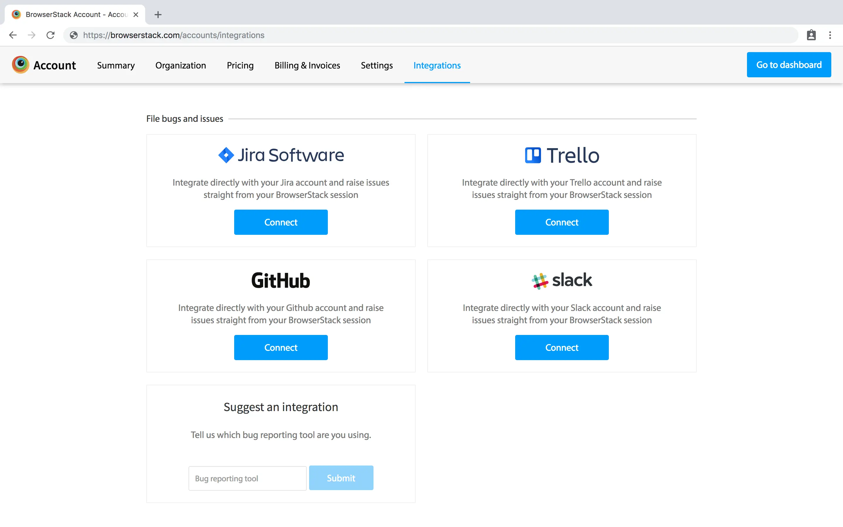 The Integrations page will be your central place to manage your different integrations. If you are using a bug filing tool that we do not support currently, you can suggest the same in the Suggestion Box available at the bottom of the Integrations page.