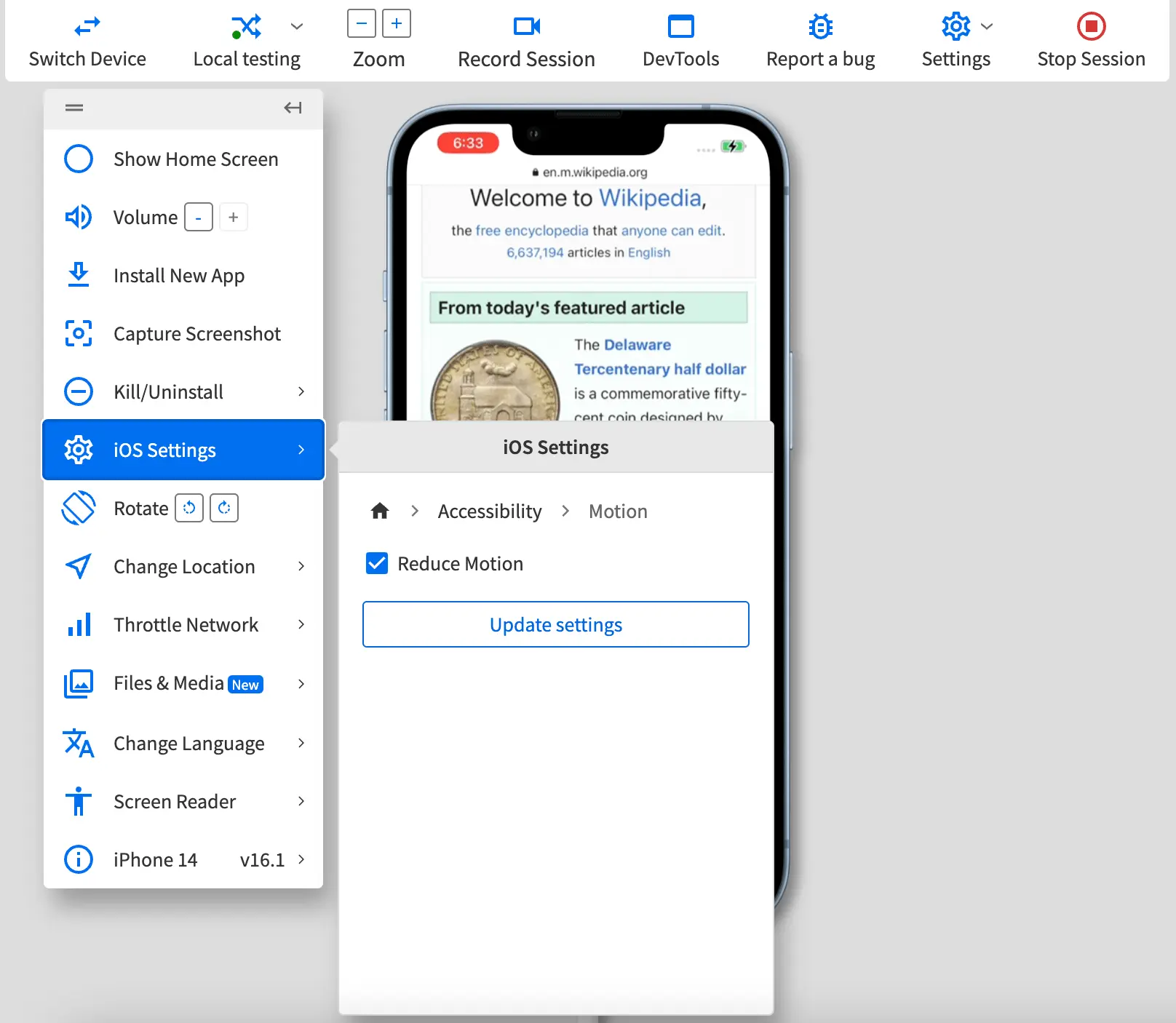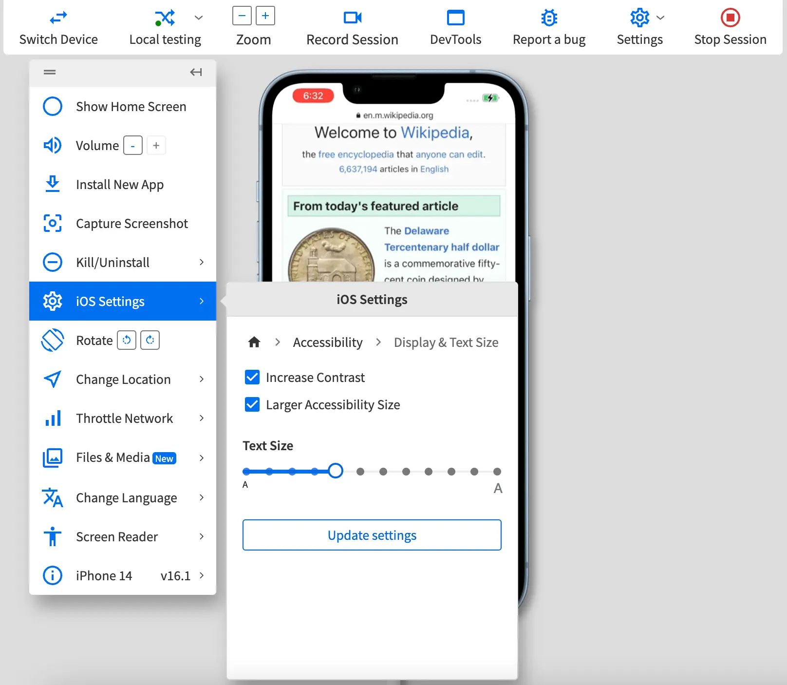 App Live provides access to select accessibility settings on BrowserStack real iOS devices, to enable accessibility testing of your apps