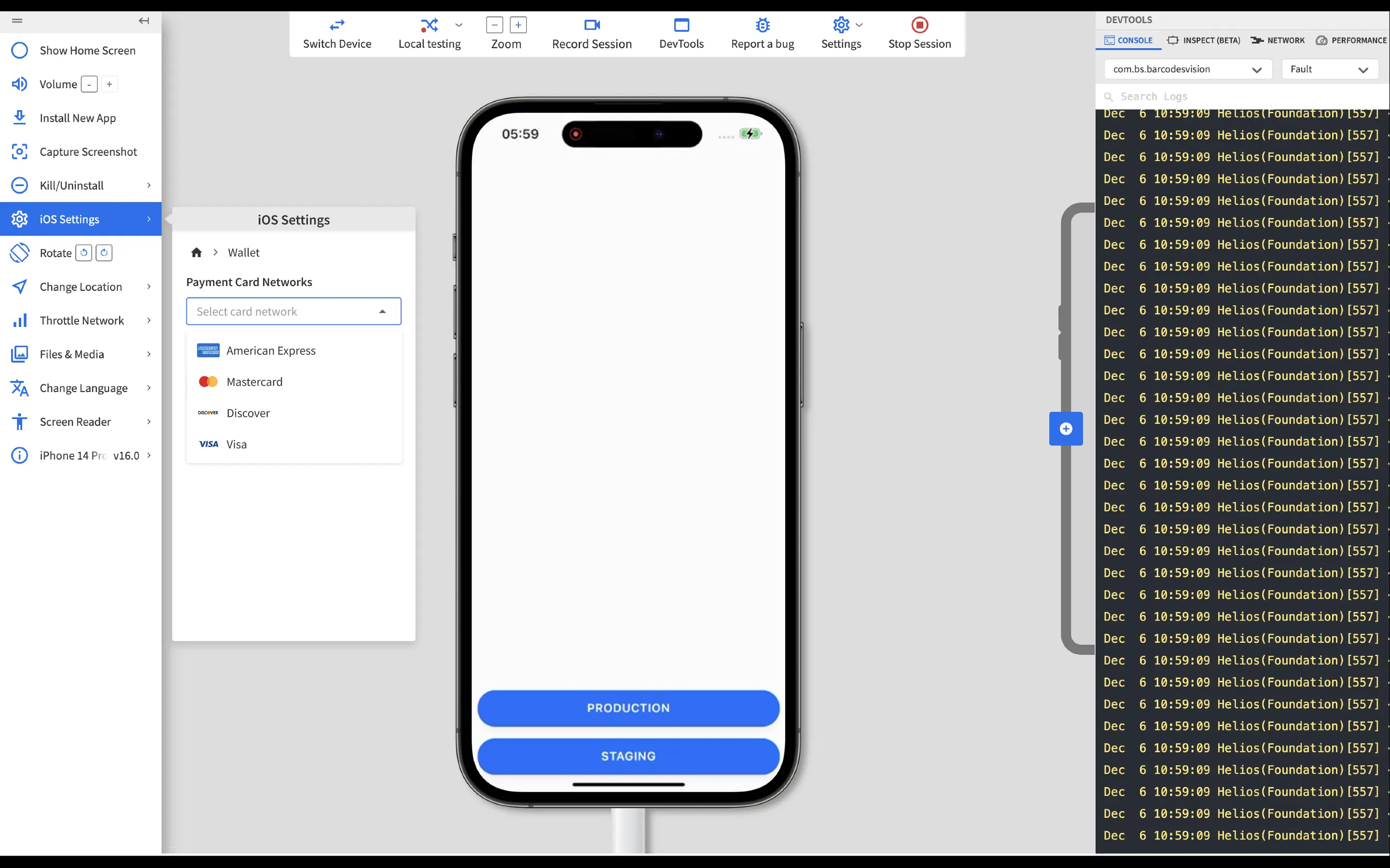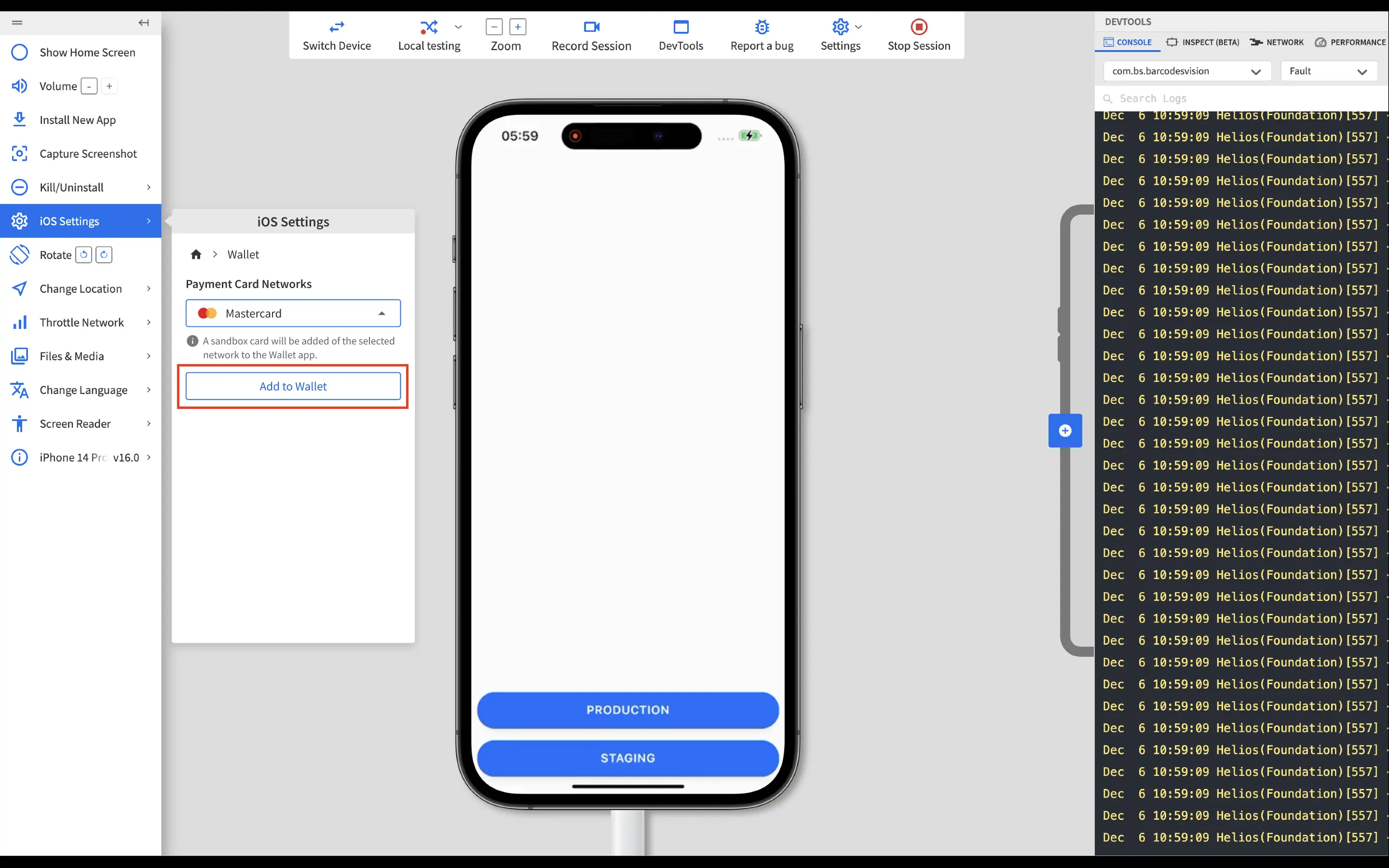 When you launch a new test session on a device that supports Apple Pay, the iOS Settings > Wallet prompt opens by default, asking you to add a payment card.