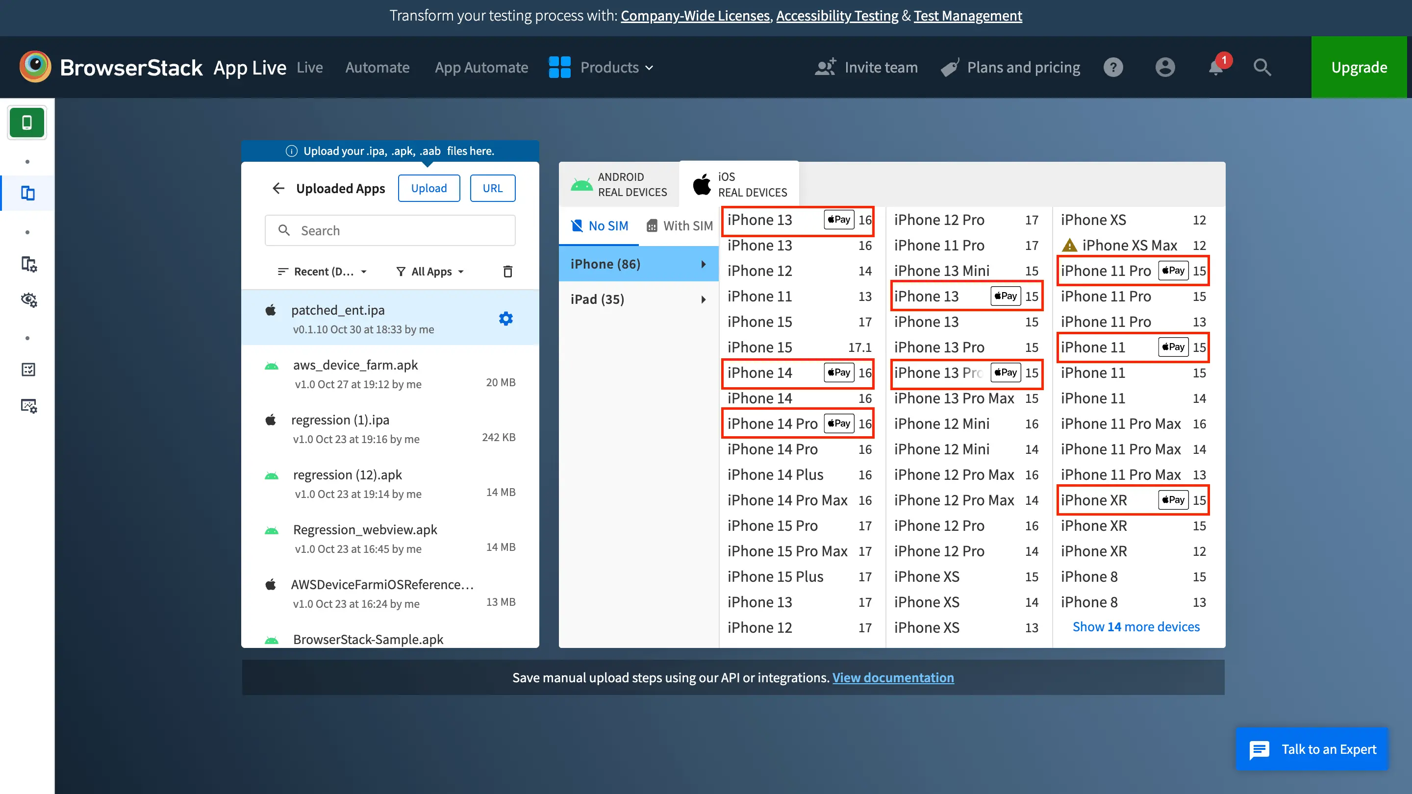 - Upload and select your app, select an iOS device with the Apple Pay logo on the device listing, and click Launch session on the prompt.