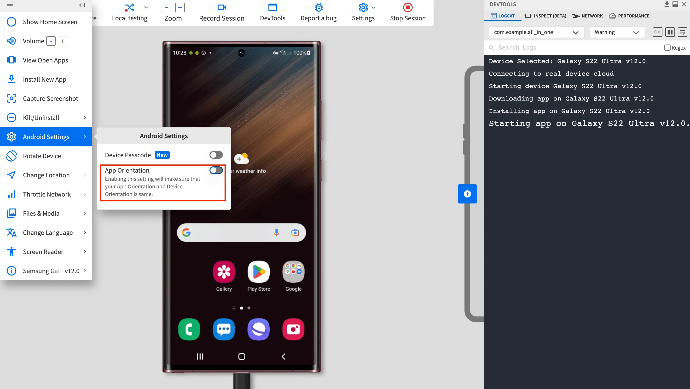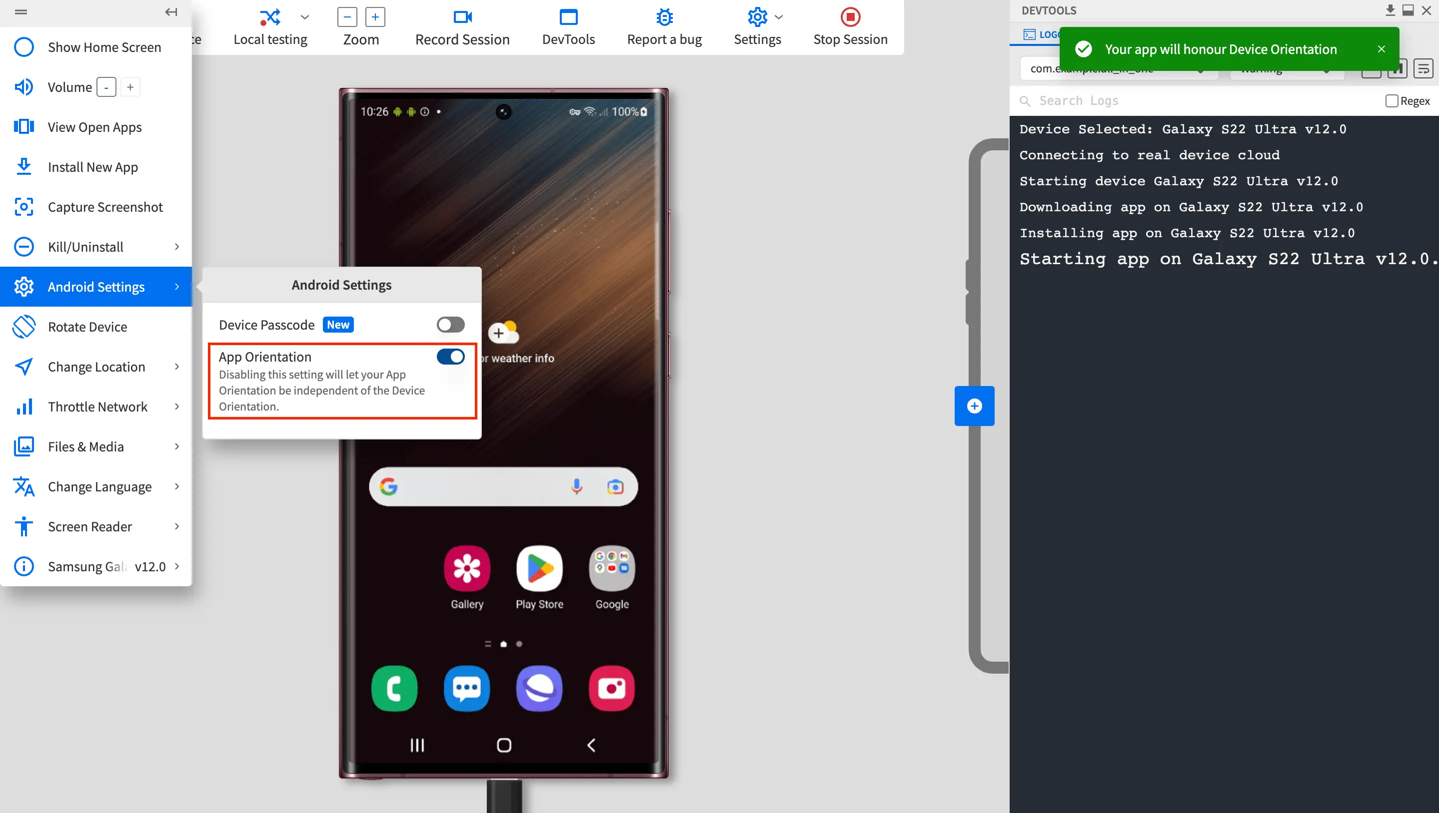 App Live enables you to delink your app orientation from the device orientation on BrowserStack real Android devices, to test use cases that require testing app orientation independent of the device orientation.
