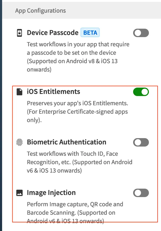 - Enable the iOS Entitlements option, and disable the Biometric Authentication and Image Injection options.