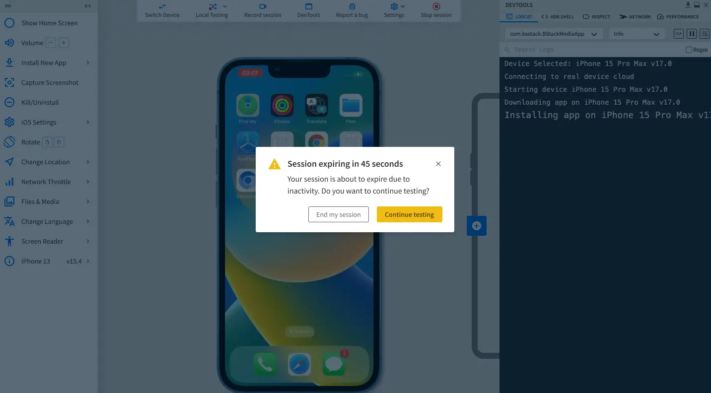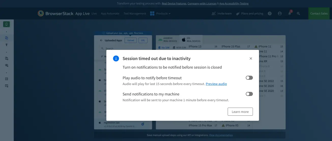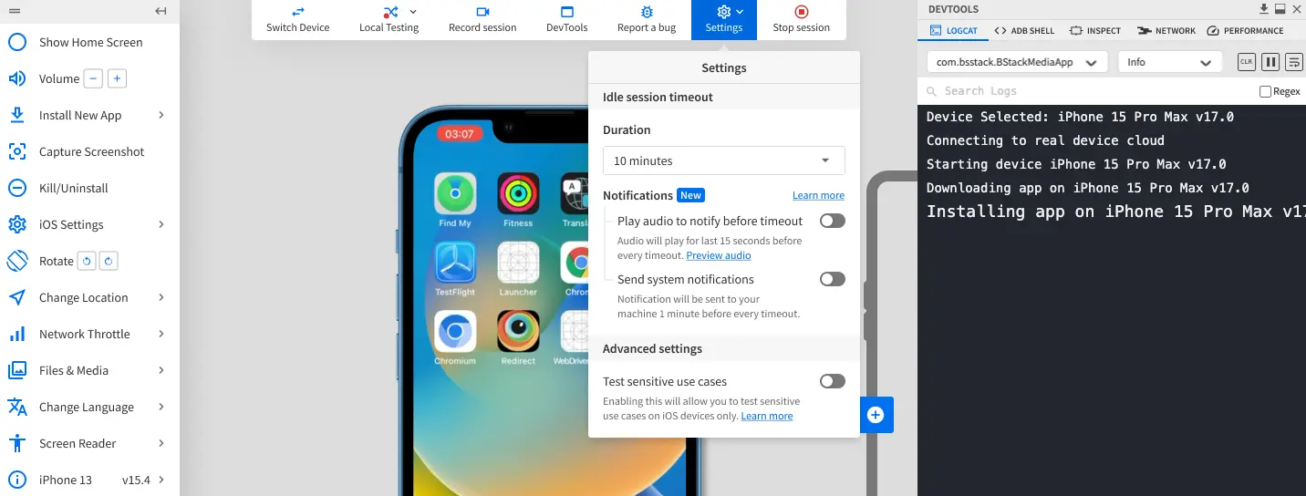 Idle session timeout refers to the time that your App Live test session can remain idle without any activity, before being logged out of the session. App Live implements the idle timeout setting for optimal utilization of BrowserStack devices and network resources, and adding a security layer for your test sessions.