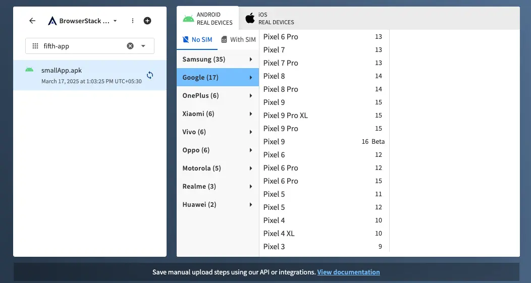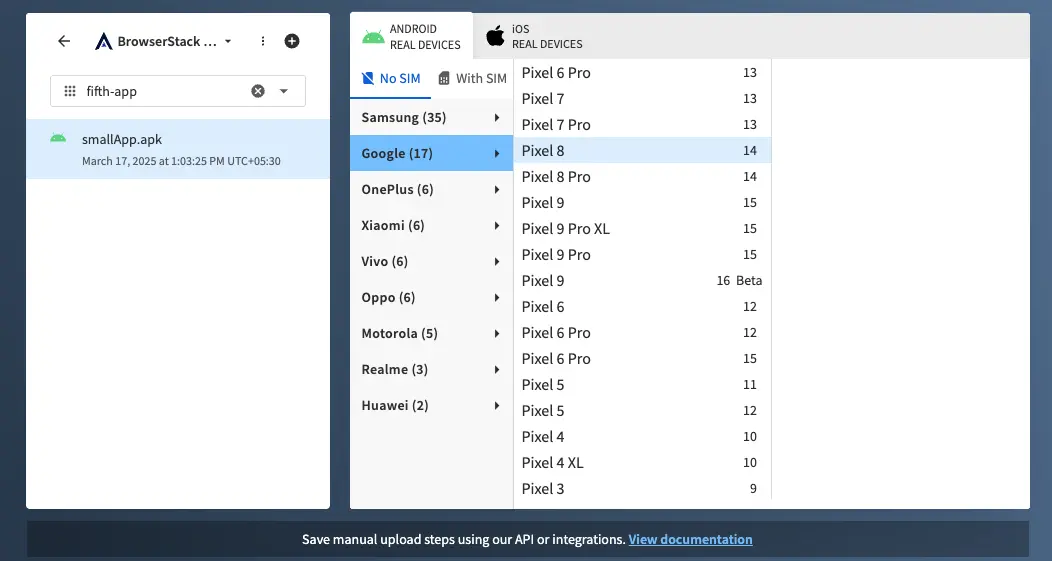 - Select the device from the device list. After you select the device and app, the app is synchronized automatically to use the latest app for the session.