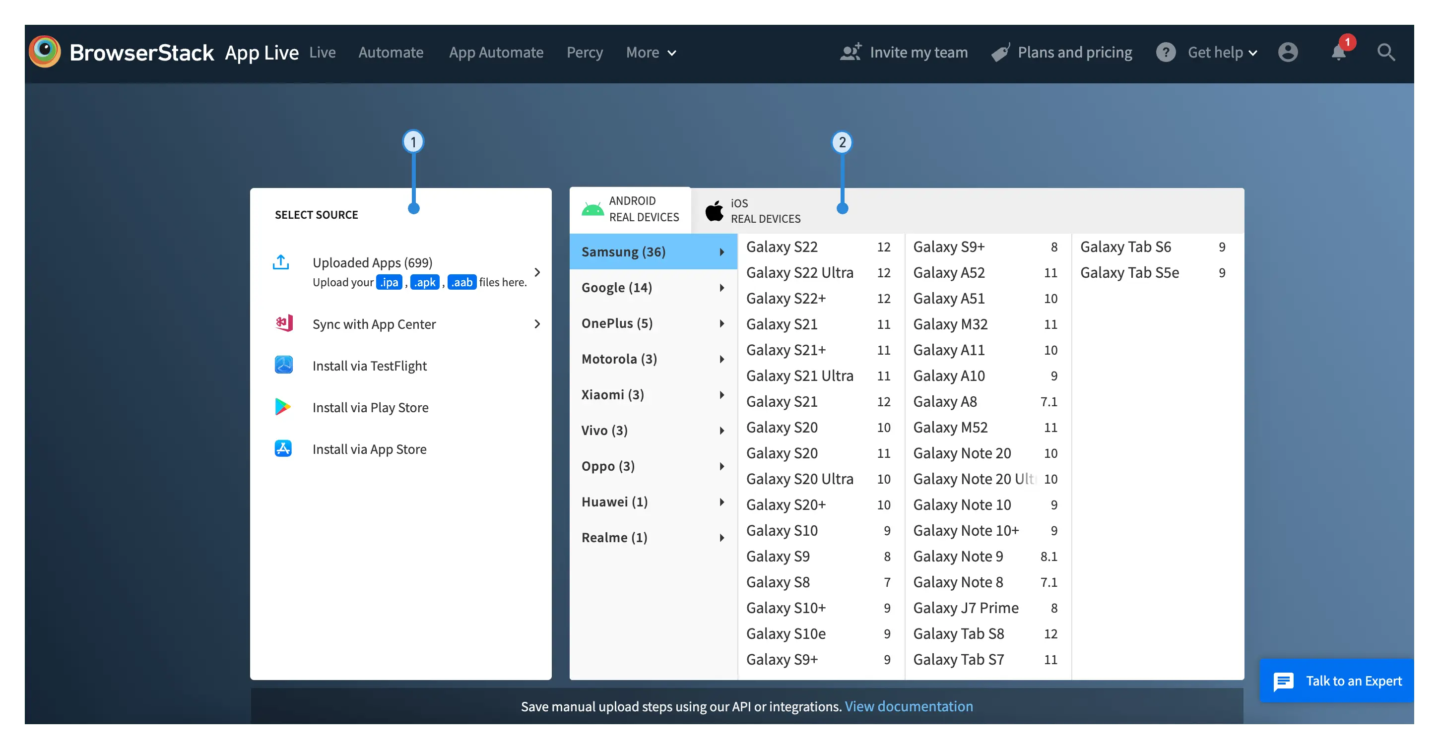 - Device listing: List of real Android and iOS devices on which you can test your apps.