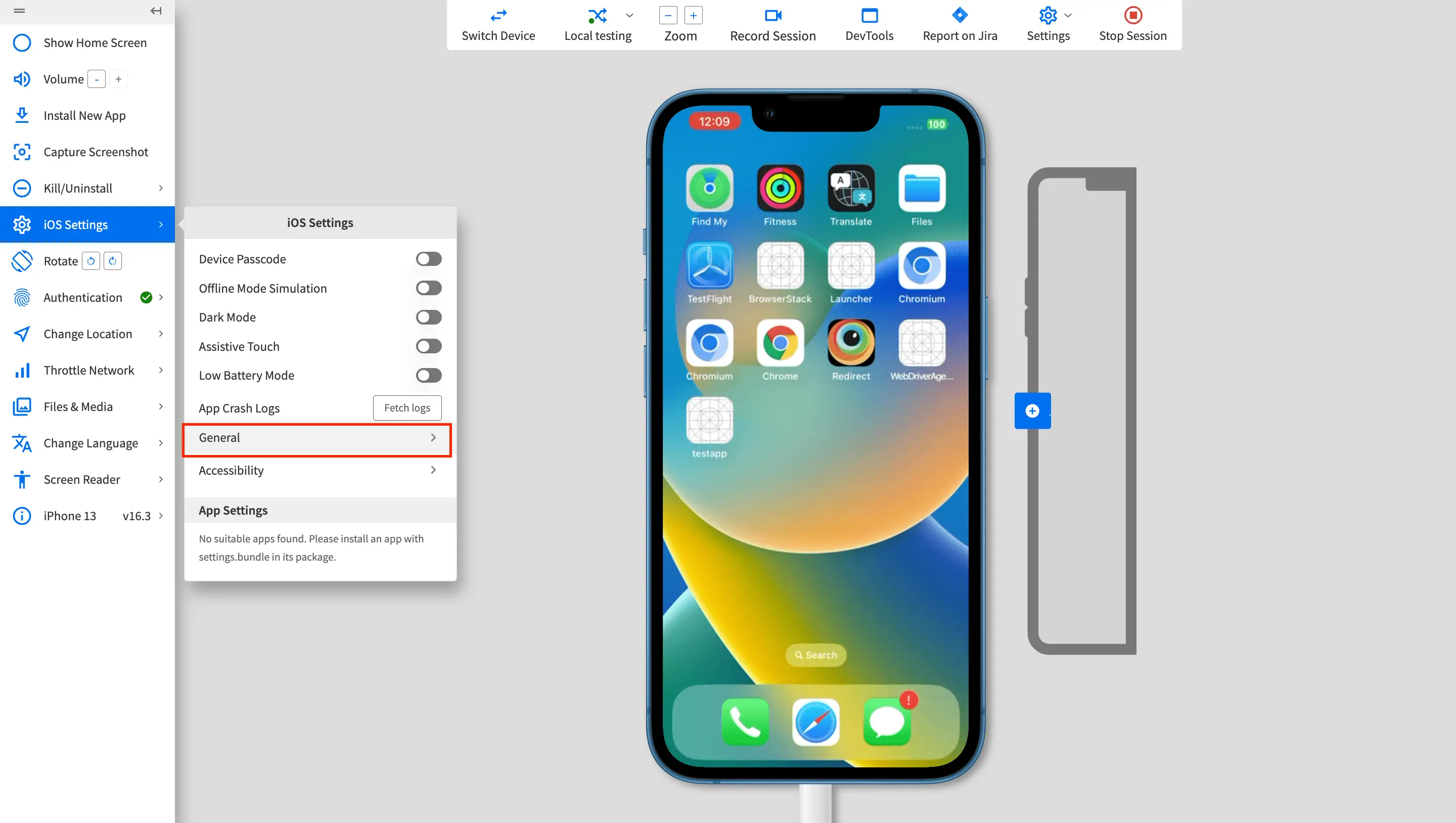 - On the App Live vertical toolbar, click iOS Settings > General.