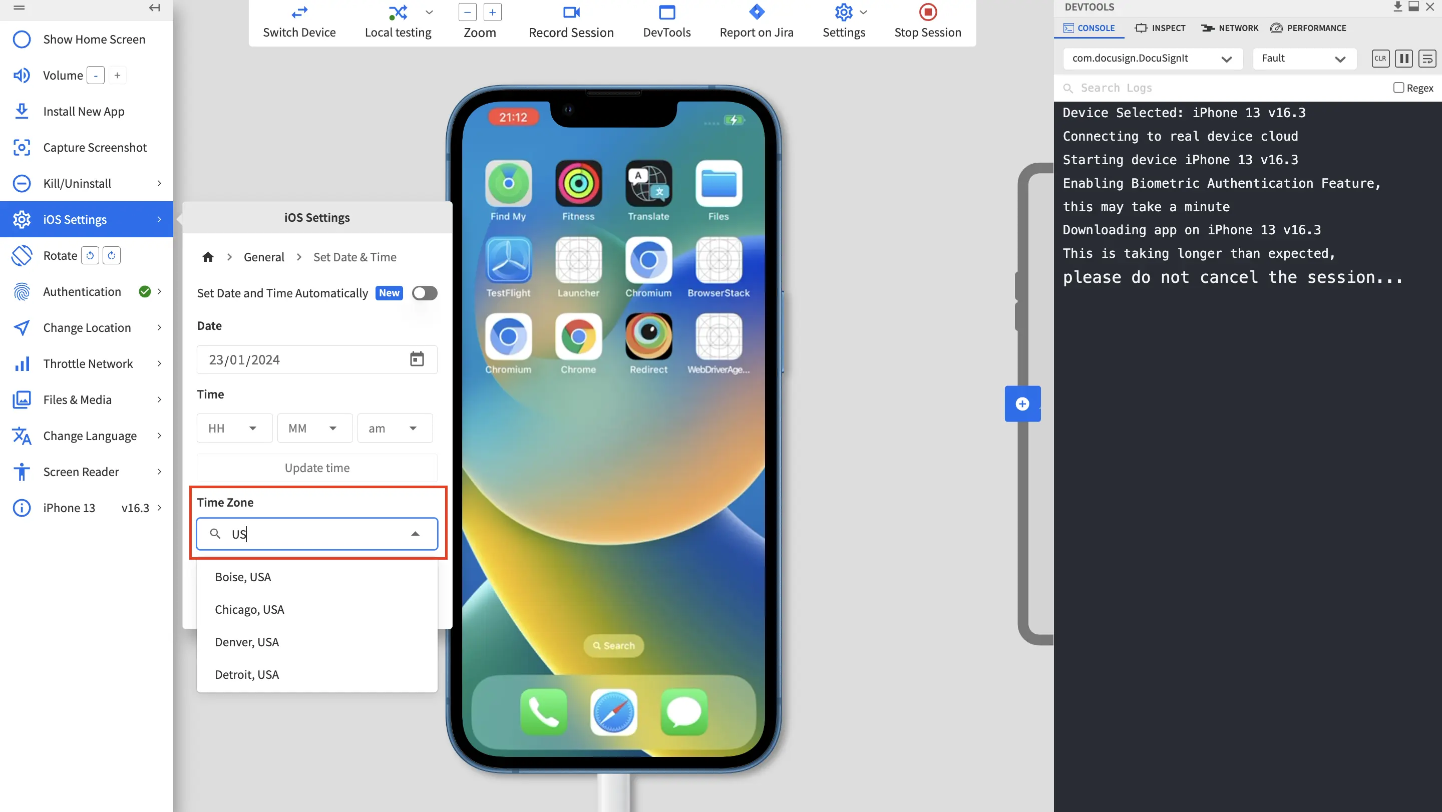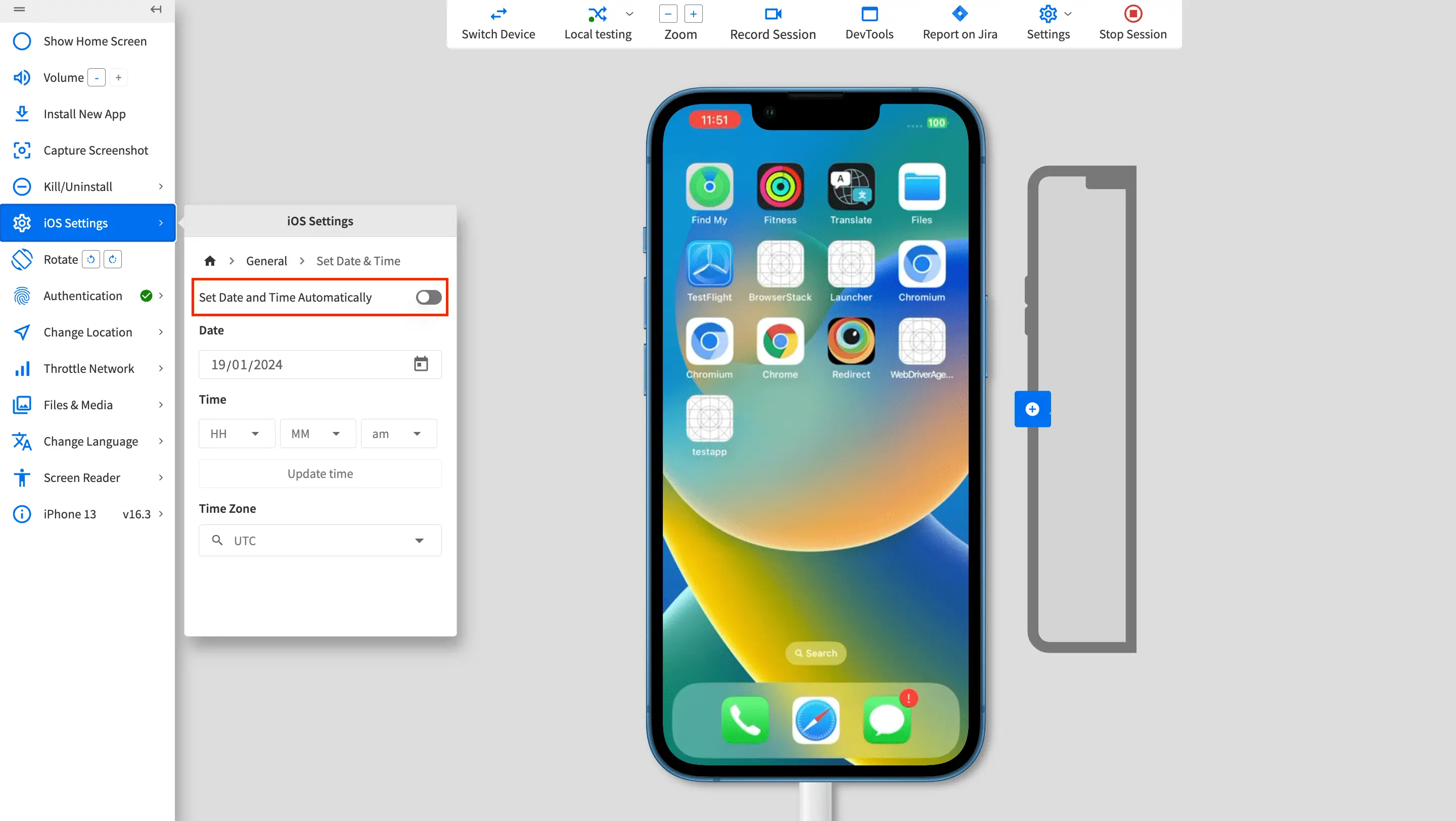 You can set the date, time, and time zone of your preference on BrowserStack devices to test app scenarios that require different date, time, and time zone on App Live. For example, time-specific notifications and updates, test cases with future timelines, timestamps for chat sessions on remote devices, and more.