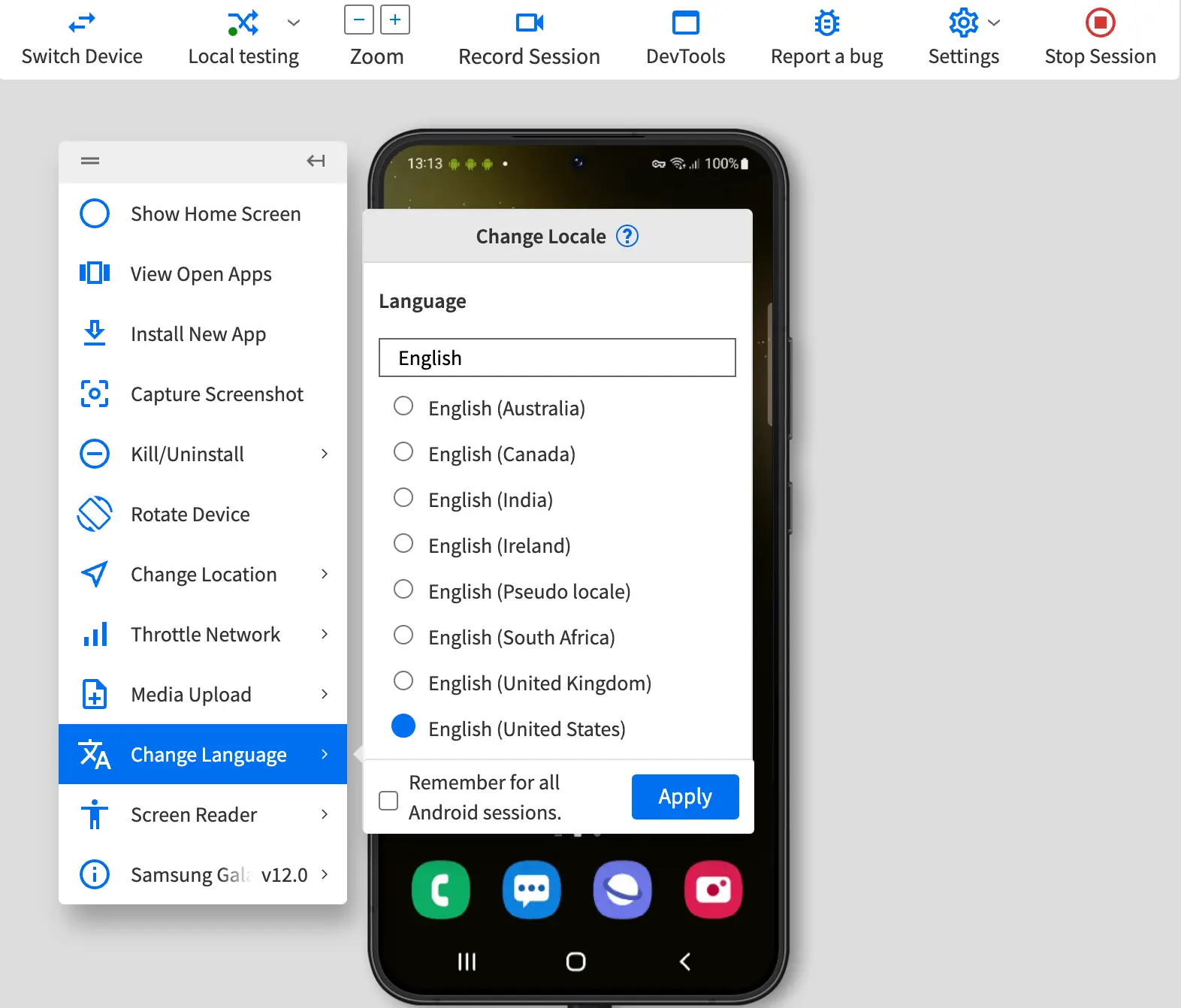 App Live enables you to test your app in different languages on BrowserStack real devices. You can test localized resources such as app strings and visuals, data format, text input, etc.