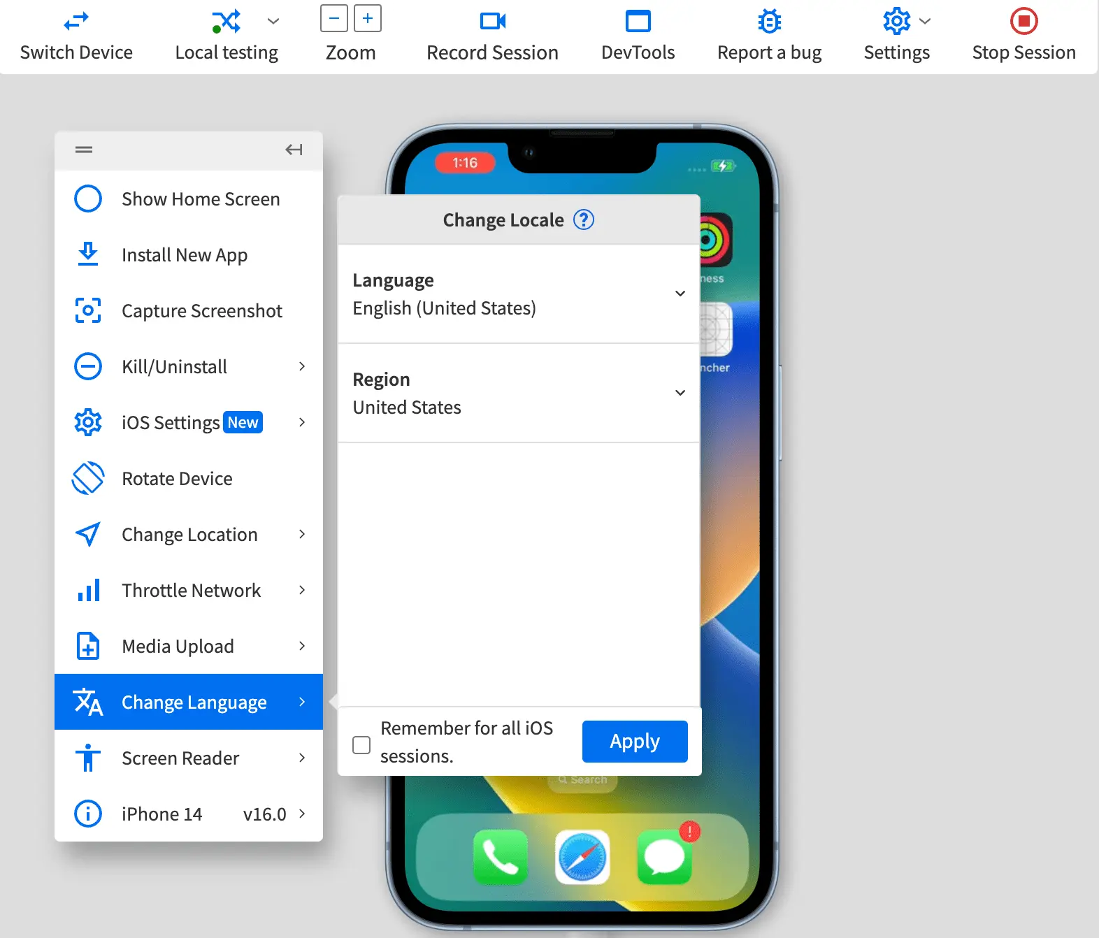 Click the Remember for all iOS sessions checkbox if you want to use the same language and region for subsequent App Live test sessions.