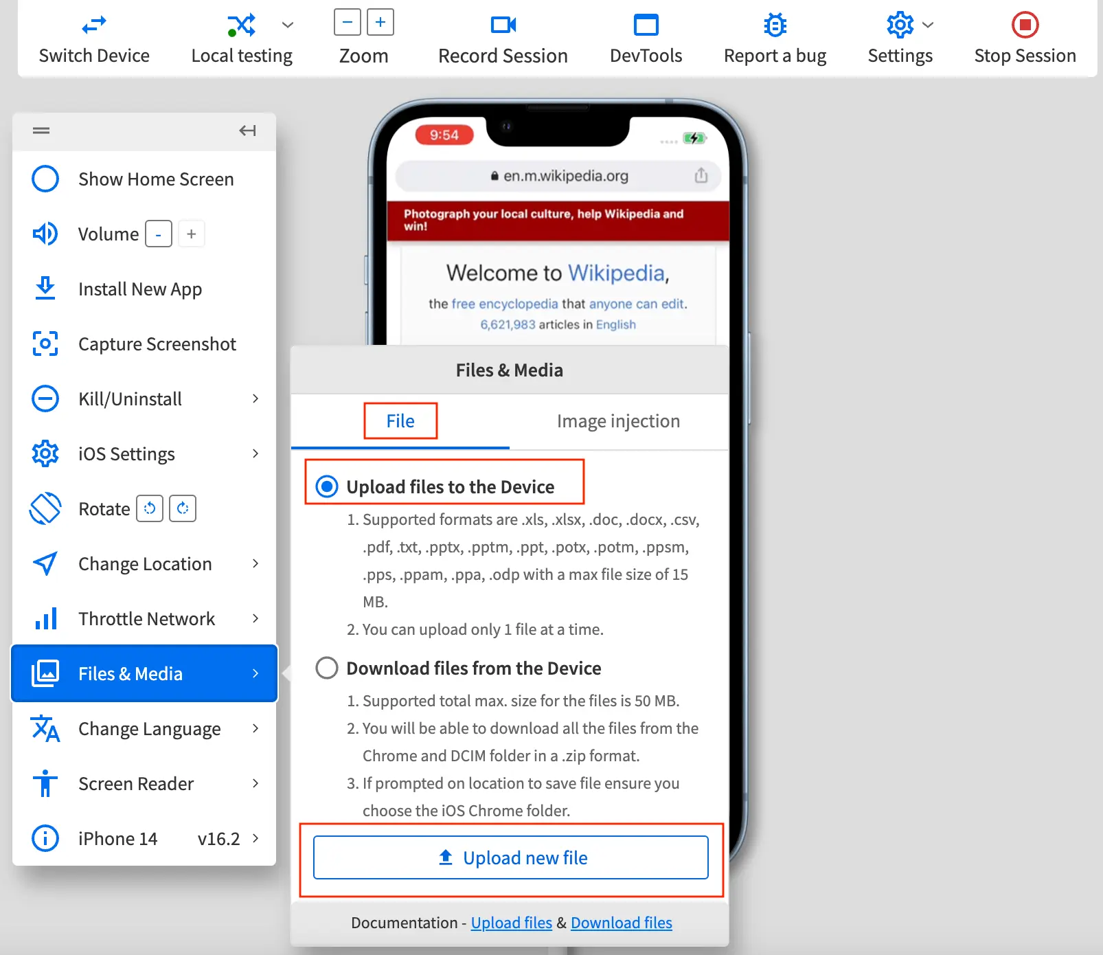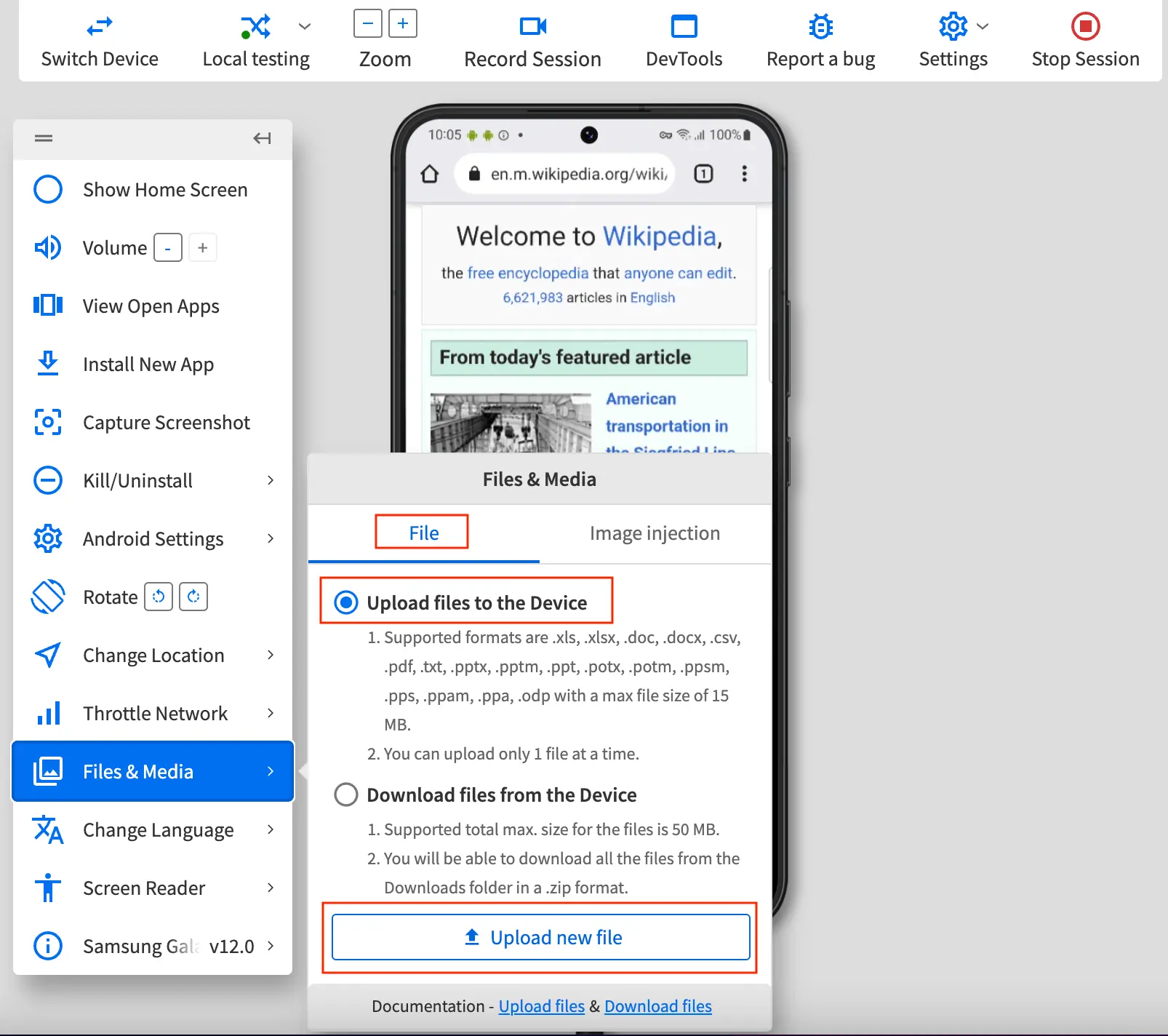 App Live enables you to upload files to BrowserStack real devices and test use cases such as moving the uploaded files to your app and downloading files from your app to the BrowserStack real device.
