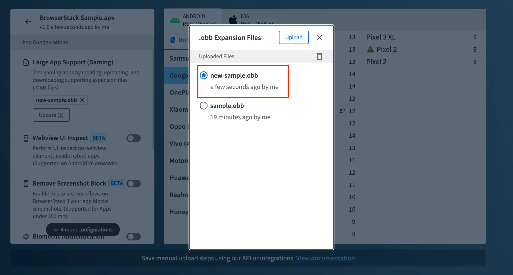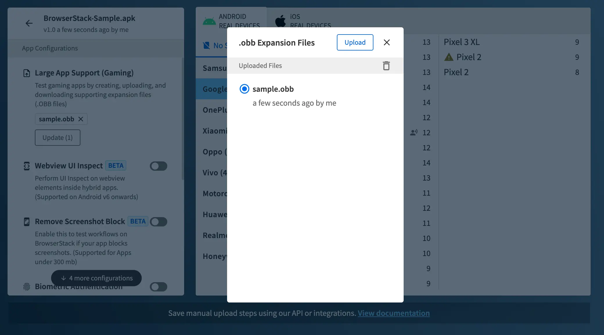 Upload OBB files to BrowserStack real Android devices