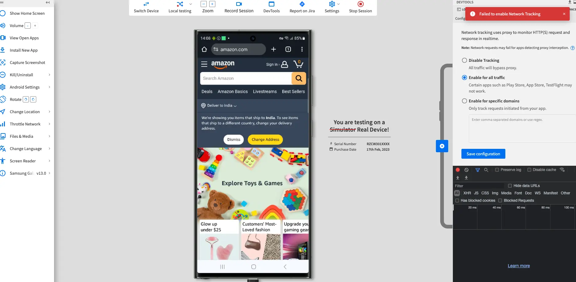 When you run a test using BrowserStack App Live, a Failed to enable network tracking error might appear on the App Live dashboard.