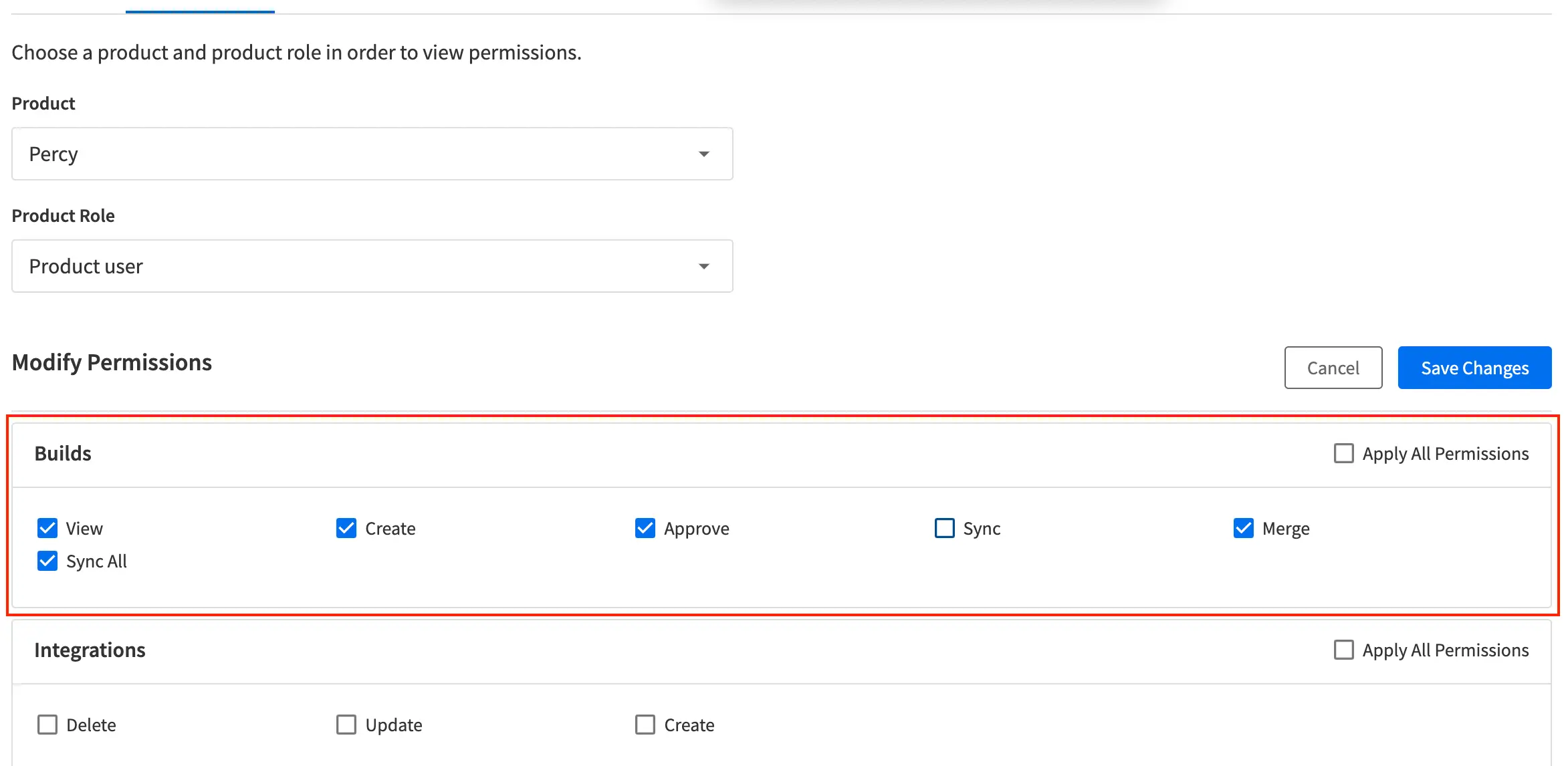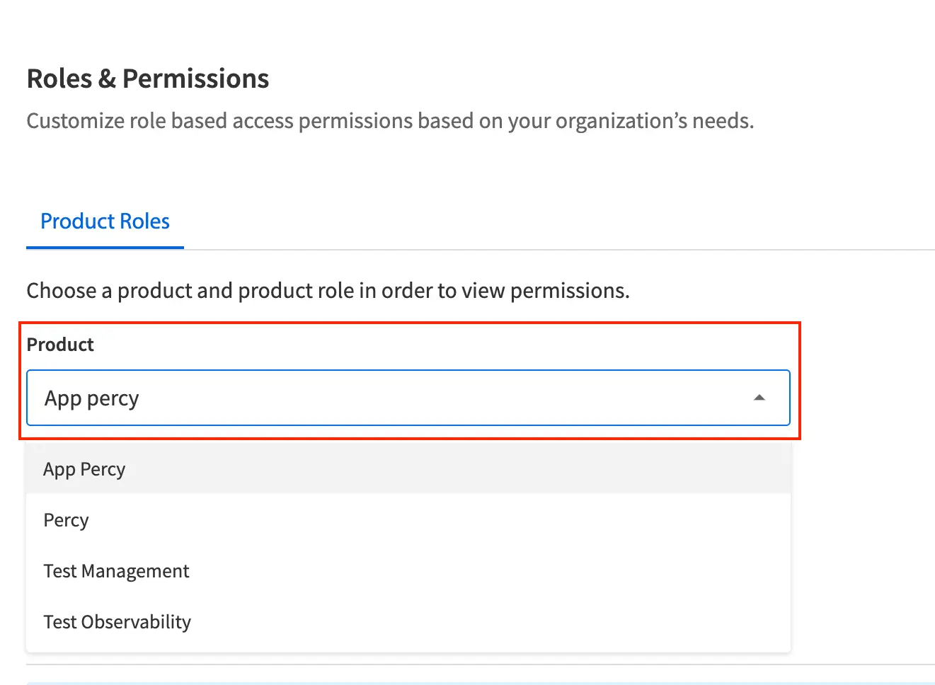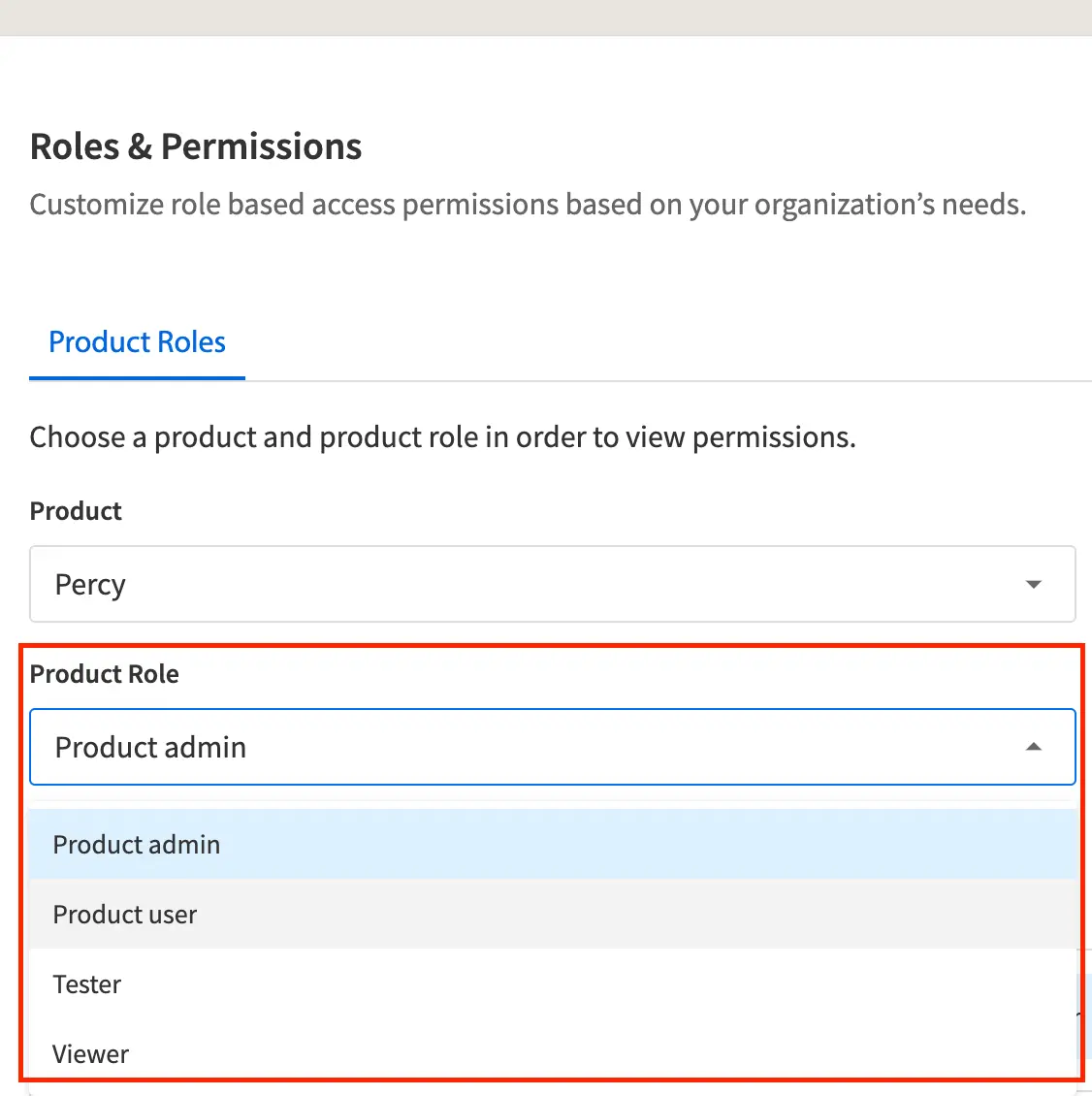 The product role controls access to specific functions in App Percy. Following are the product roles in App Percy: